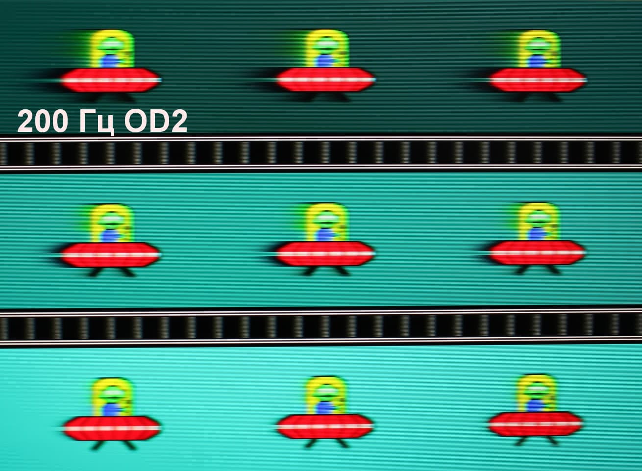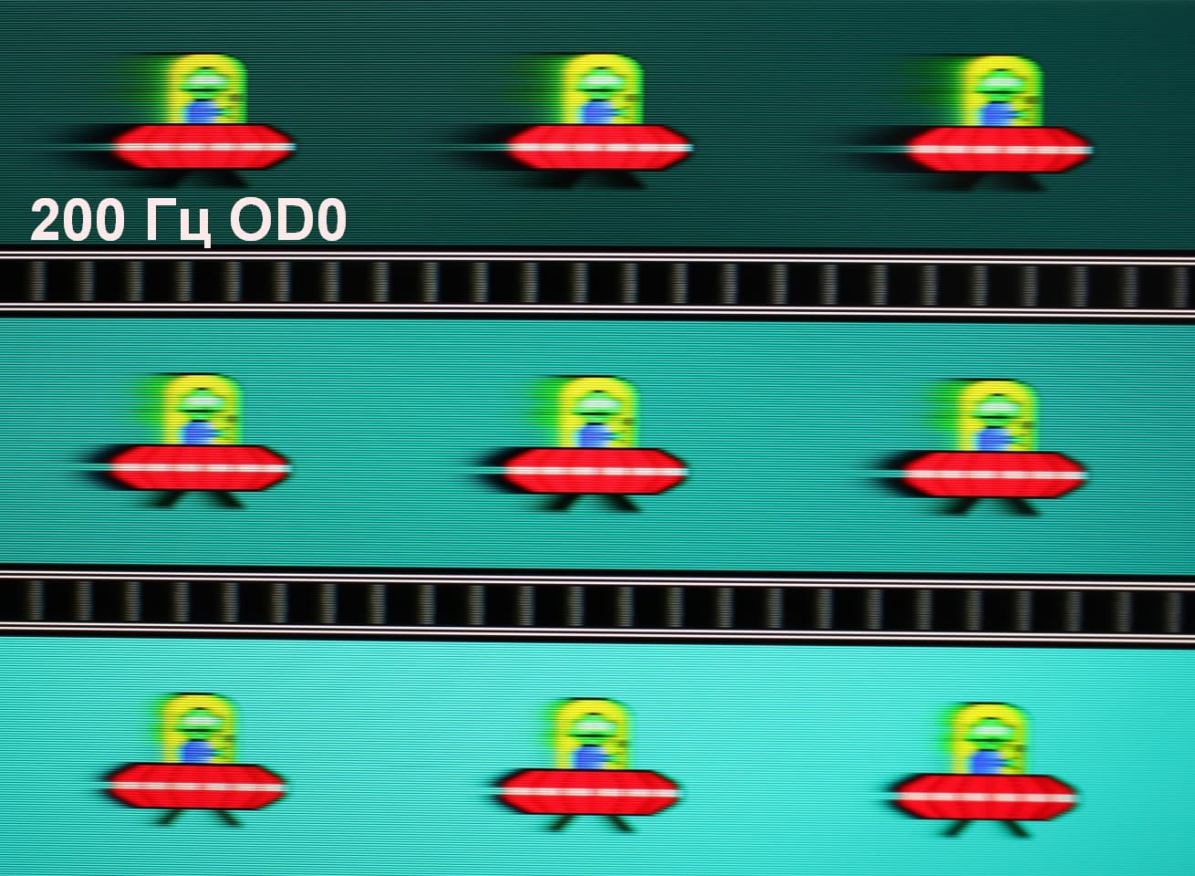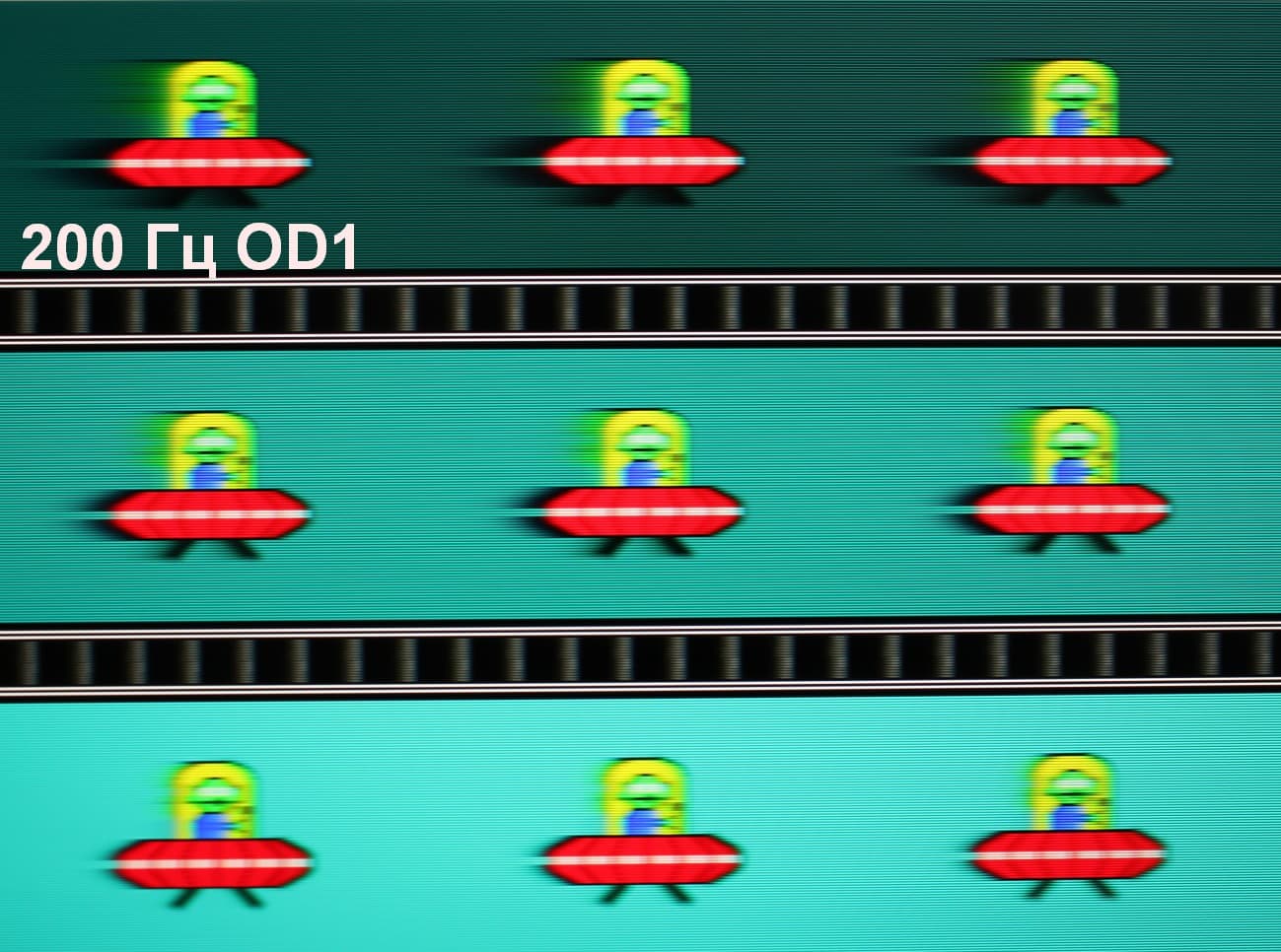 Для наглядного представления о том, что на практике означает такая скорость матрицы, какие могут быть артефакты от разгона и повышает ли четкость в движении, описанная выше настройка MPRT приведем серию снимков, полученных с помощью движущейся камеры. Такие снимки показывают, что видит человек, если он следит глазами за двигающимся на экране объектом. Описание теста приведено тут, страница с самим тестом тут. Использовались рекомендованные установки (скорость движения 960 и 1000 пиксель/с для частот обновления 60 (и 120) и 200 Гц, соответственно), выдержка 1/15 с, на фотографиях указаны значения частоты обновления, а также ступени разгона (ODx) и настройки MPRT.