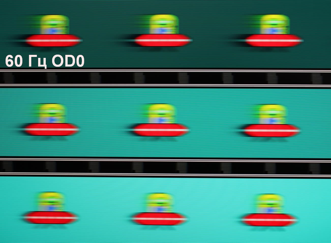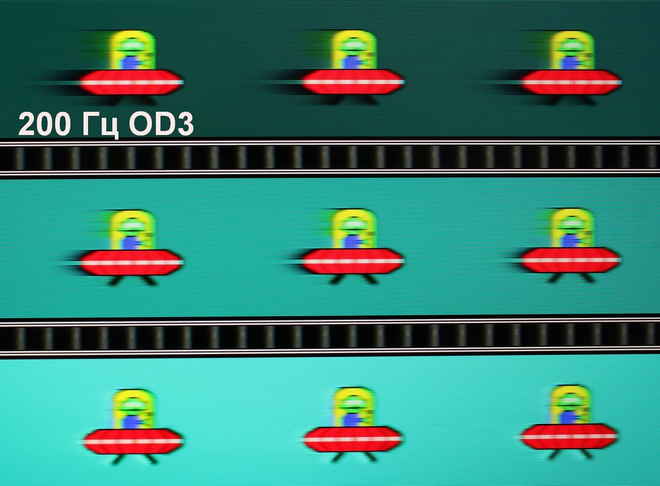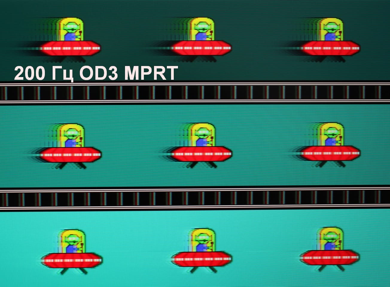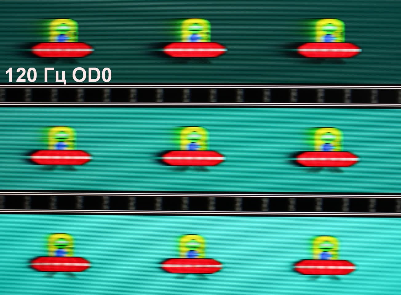 Для наглядного представления о том, что на практике означает такая скорость матрицы, какие могут быть артефакты от разгона и повышает ли четкость в движении, описанная выше настройка MPRT приведем серию снимков, полученных с помощью движущейся камеры. Такие снимки показывают, что видит человек, если он следит глазами за двигающимся на экране объектом. Описание теста приведено тут, страница с самим тестом тут. Использовались рекомендованные установки (скорость движения 960 и 1000 пиксель/с для частот обновления 60 (и 120) и 200 Гц, соответственно), выдержка 1/15 с, на фотографиях указаны значения частоты обновления, а также ступени разгона (ODx) и настройки MPRT.