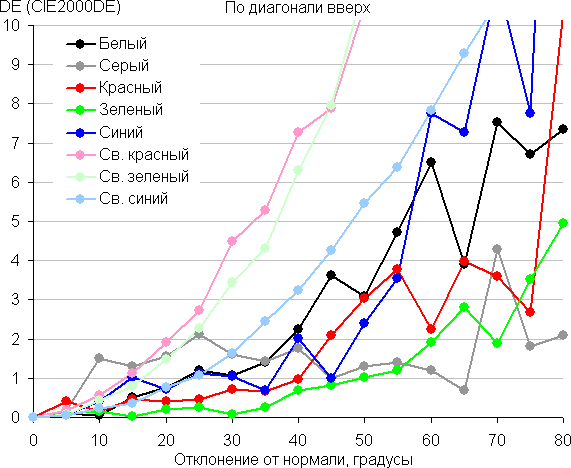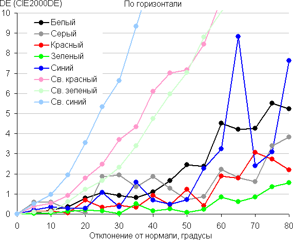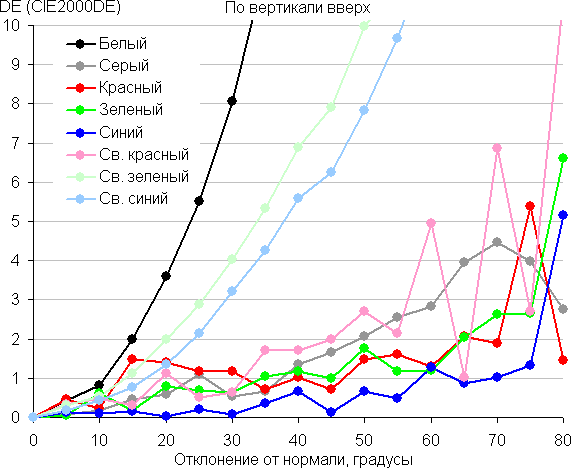 Для количественной характеристики изменения цветопередачи мы провели колориметрические измерения для белого, серого (127, 127, 127), красного, зеленого и синего, а также светло-красного, светло-зеленого и светло-синего полей во весь экран с использованием установки, подобной той, что применялась в предыдущем тесте. Измерения проводились в диапазоне углов от 0° (датчик направлен перпендикулярно к экрану) до 80° с шагом в 5°. Полученные значения интенсивностей были пересчитаны в ΔE относительно замера каждого поля при перпендикулярном положении датчика относительно экрана. Результаты представлены ниже: