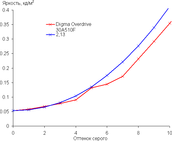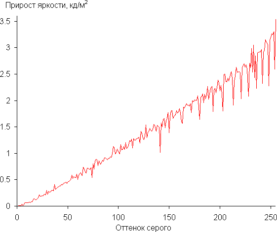 Мы измерили яркость 256 оттенков серого (от 0, 0, 0 до 255, 255, 255) при настройке Гамма = 2.2 (так по умолчанию). График ниже показывает прирост (не абсолютное значение!) яркости между соседними полутонами: