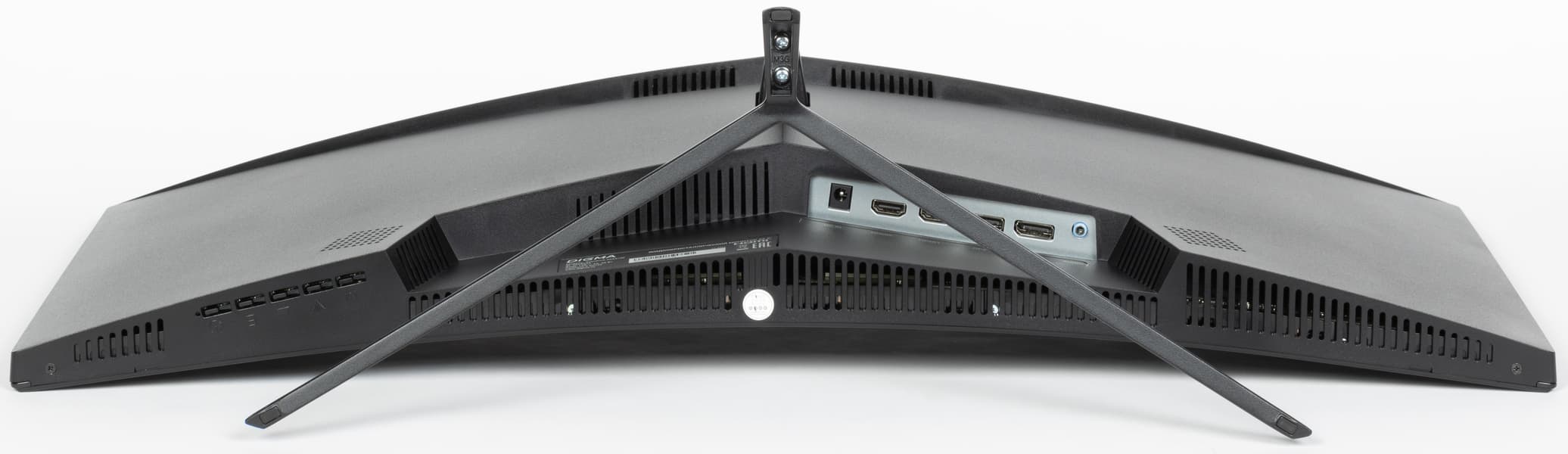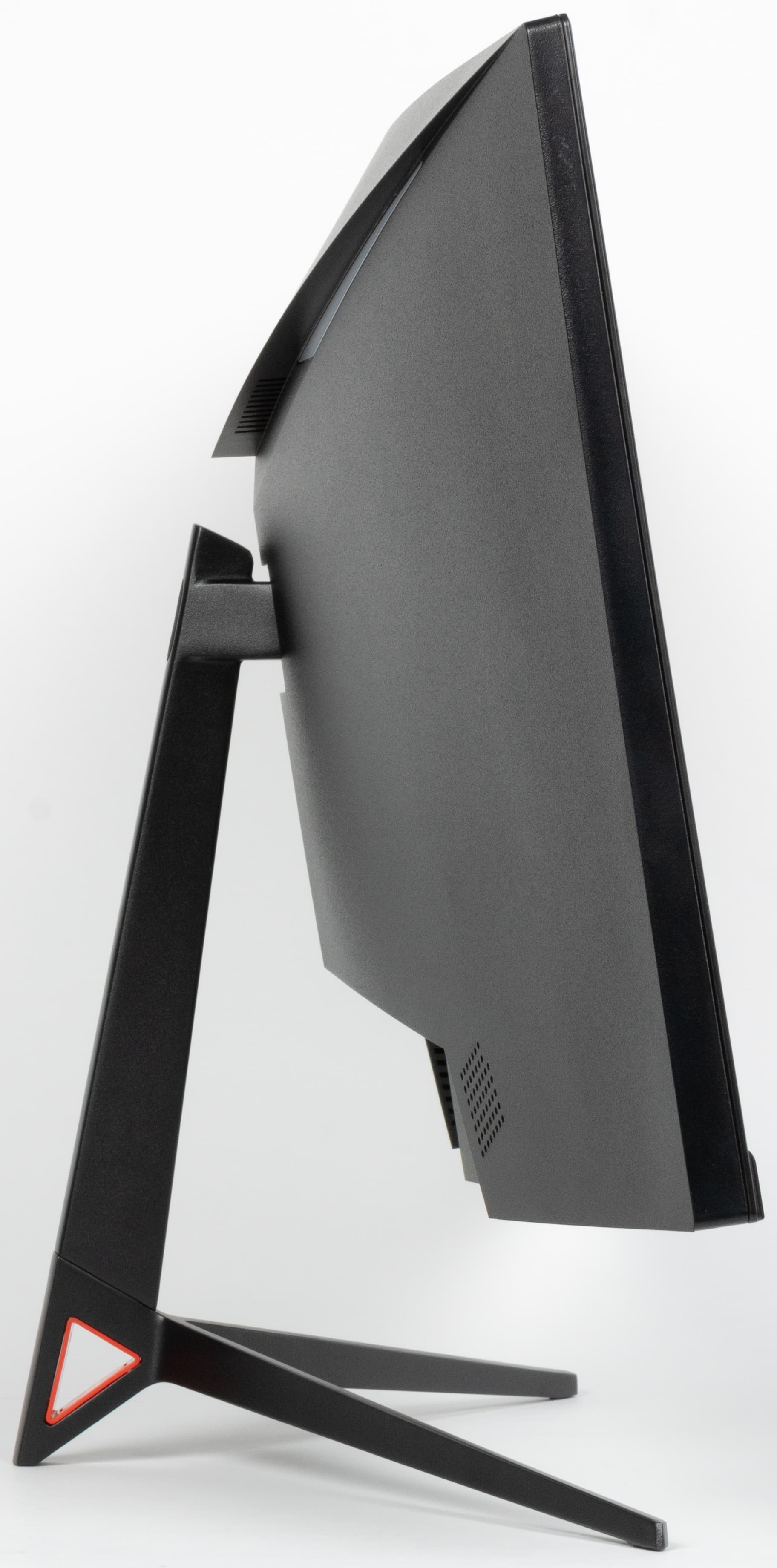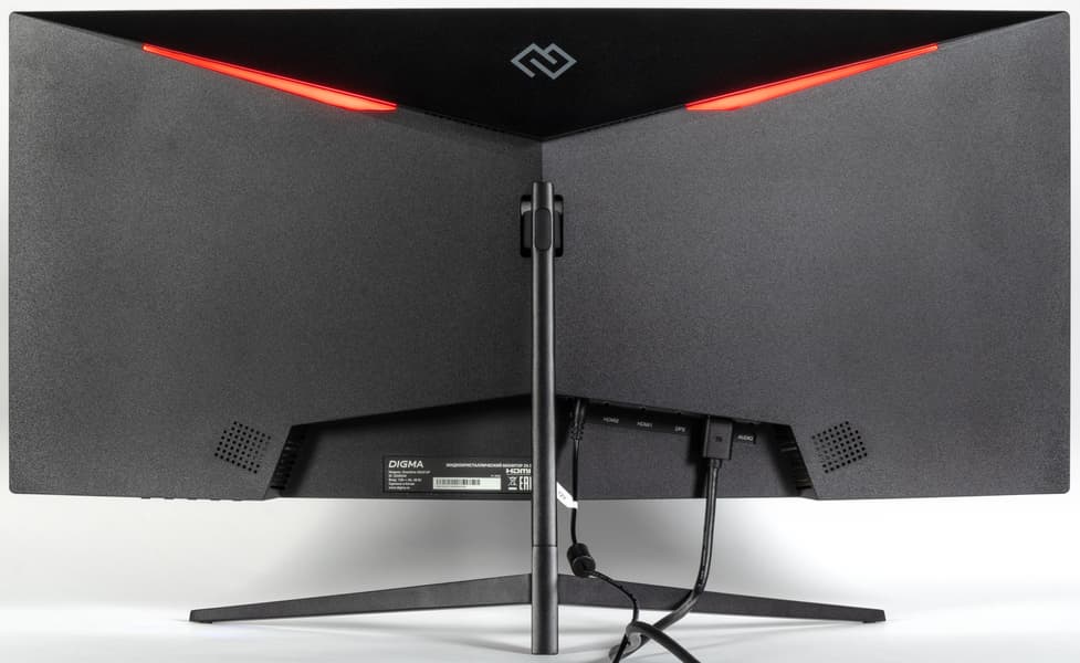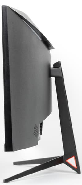 Дизайн умеренно игровой. Панели блока экрана изготовлены из черного пластика с матовой поверхностью. Ориентацию на игроков выдают трехпалое основание подставки, которая изготовлена из алюминиевого сплава и имеет стойкое матовое черное покрытие, красная вставка в нижней части стойки, а также красная декоративная подсветка на задней панели. Внешняя поверхность матрицы черная, полуматовая (зеркальность хорошо выражена), внешний слой матрицы жесткий. Плоскость экрана изогнута по цилиндру с заявленным с радиусом кривизны 1800 мм так, что правый и левый край немного выдвинуты вперед. Спереди экран выглядит как монолитная поверхность, ограниченная снизу неширокой планкой, а по периметру — узкой окантовкой. Выведя изображение на экран, можно увидеть, что на самом деле между внешними границами матрицы и собственно областью отображения есть узкие поля. По центру нижней планки есть логотип производителя, выполненный светло-серой краской.