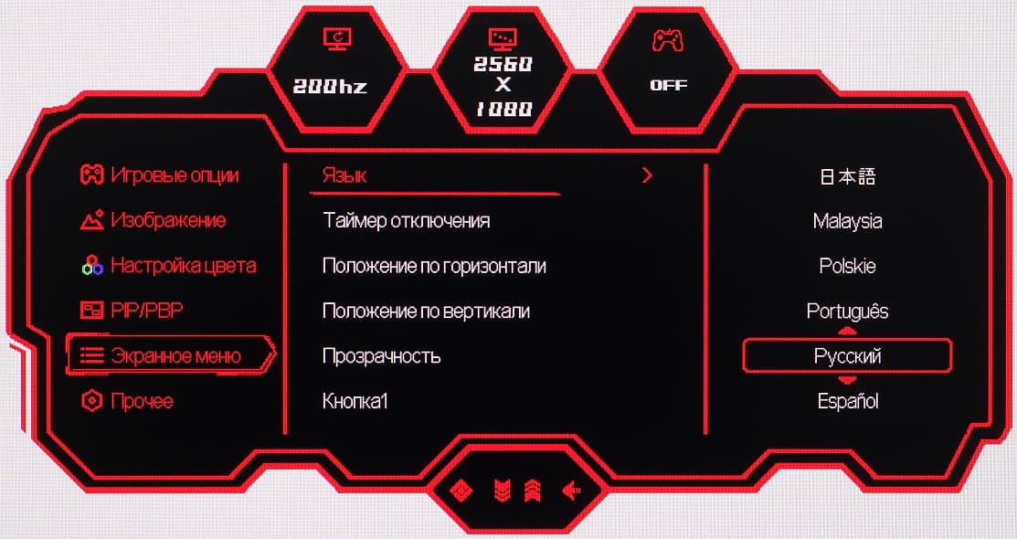 Настраиваются положение меню на экране, уровень прозрачности фона и задержка автоматического выхода из меню. Можно включить блокировку меню. Присутствует русская версия экранного меню.