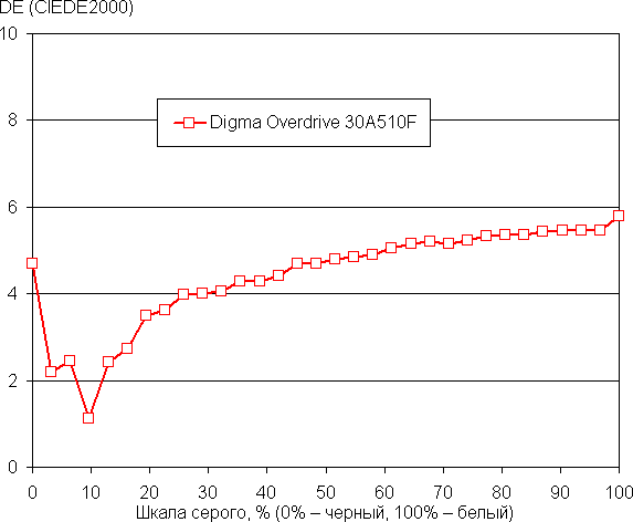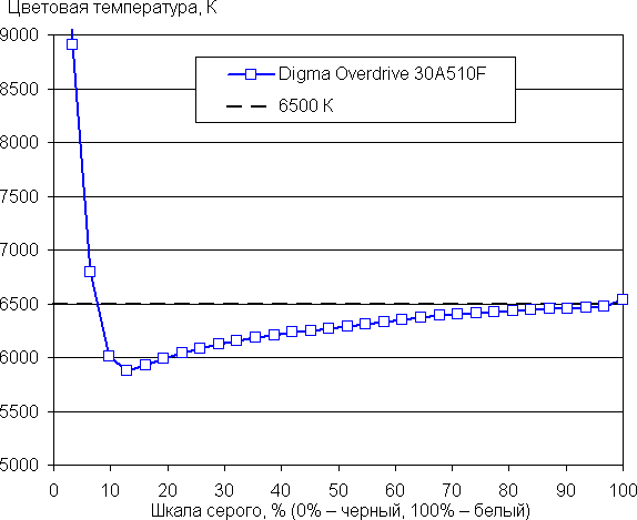 Цветовой баланс просто при выборе профиля Пользователь без коррекции, который обеспечивает максимальную яркость и контрастность с сохранением приемлемого качества изображения, хороший, так как цветовая температура достаточно близка к стандартным 6500 К, и отклонение от спектра абсолютно черного тела (параметр ΔE) ниже 10 единиц, что для потребительского устройства считается приемлемым показателем. При этом оба параметра мало изменяются на различных участках шкалы серого, что улучшает визуальное восприятие цветового баланса.