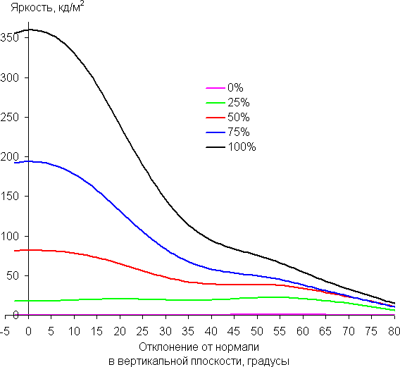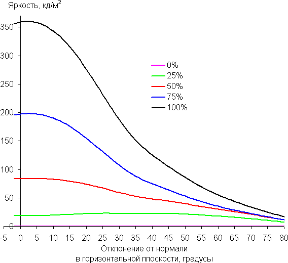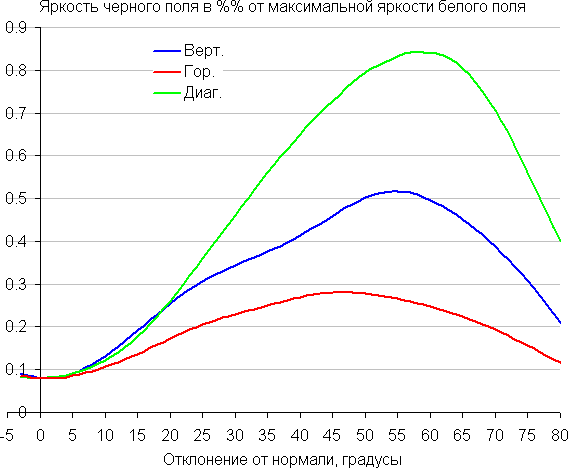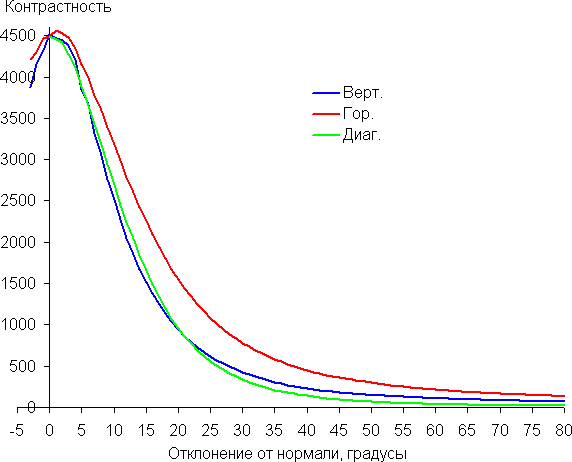 По скорости падения яркости углы обзора неширокие. Отметим примерно одинаковый характер уменьшения яркости при отклонении от перпендикуляра к экрану во всех трех направлениях, при этом графики не пересекаются в значимом диапазоне измеряемых углов. При отклонении в диагональном направлении яркость черного поля достигает большего значения, чем в двух других случаях. Однако максимум яркости черного поля все равно гораздо меньше, чем в случае типичного монитора на матрице IPS. Контрастность в диапазоне углов ±82° остается существенно выше значения 10:1.