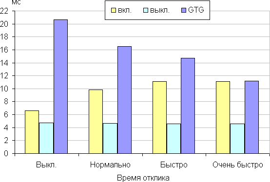 Время отклика зависит от значения одноименной настройки, которая управляет разгоном матрицы. График ниже показывает, как меняется время включения и выключения при переходе черный-белый-черный (столбики «вкл.» и «выкл.»), а также среднее суммарное время для переходов между полутонами (столбики «GTG») для нескольких значений этой настройки: