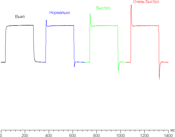 При включении разгона на графиках некоторых переходов появляются характерные всплески яркости, но амплитуда этих всплесков незначительная, поэтому визуально даже в случае максимального разгона видимых артефактов практически нет. С нашей точки зрения, после разгона скорости матрицы уже достаточно даже для самых динамичных игр.