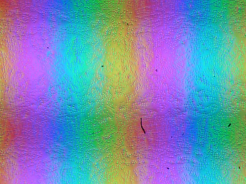 Зерно этих дефектов в несколько раз меньше размеров субпикселей, поэтому фокусировка на микродефектах и «перескок» фокуса по субпикселям при изменении угла зрения выражены слабо, из-за этого нет и «кристаллического» эффекта.