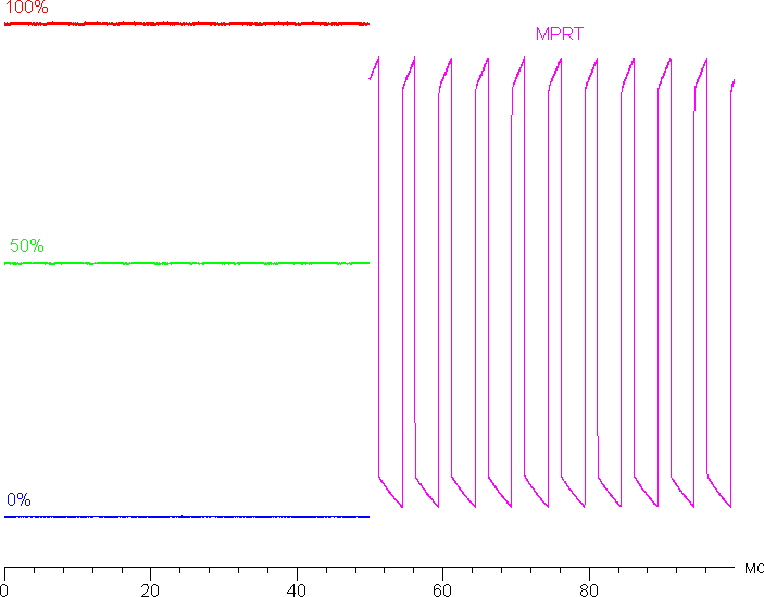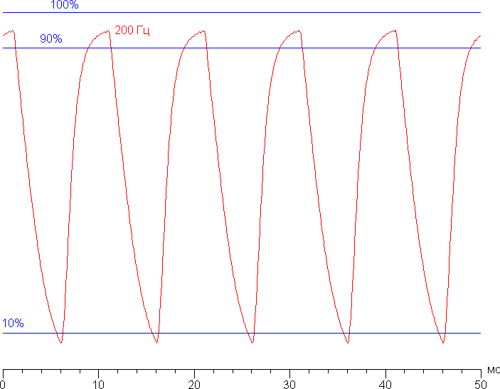 Видно, что максимальная яркость белого кадра выше уровня 90% от белого, а минимальная яркость черного кадра ниже уровня 10% от белого. Амплитуда изменения яркости выше 80% от уровня белого, то есть согласно этому формальному критерию скорости матрицы достаточно для вывода изображения с кадровой частотой 200 Гц.