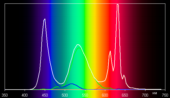 Ниже приведен спектр для белого поля (белая линия), наложенный на спектры красного, зеленого и синего полей (линии соответствующих цветов):