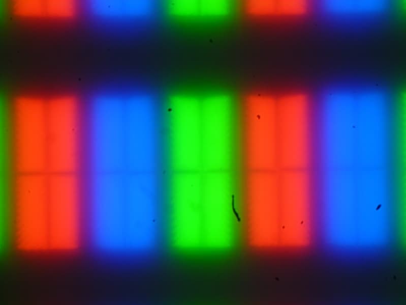 Четкое изображение структуры пикселей из-за матовой поверхности получить не удается, впрочем, на фрагменте ниже можно разглядеть типичную для VA структуру в виде параллельных полосок, а также что каждый субпиксель делится на четыре равных домена, в которых полоски ориентированы под разными углами (черные точки — это пыль на матрице фотоаппарата):