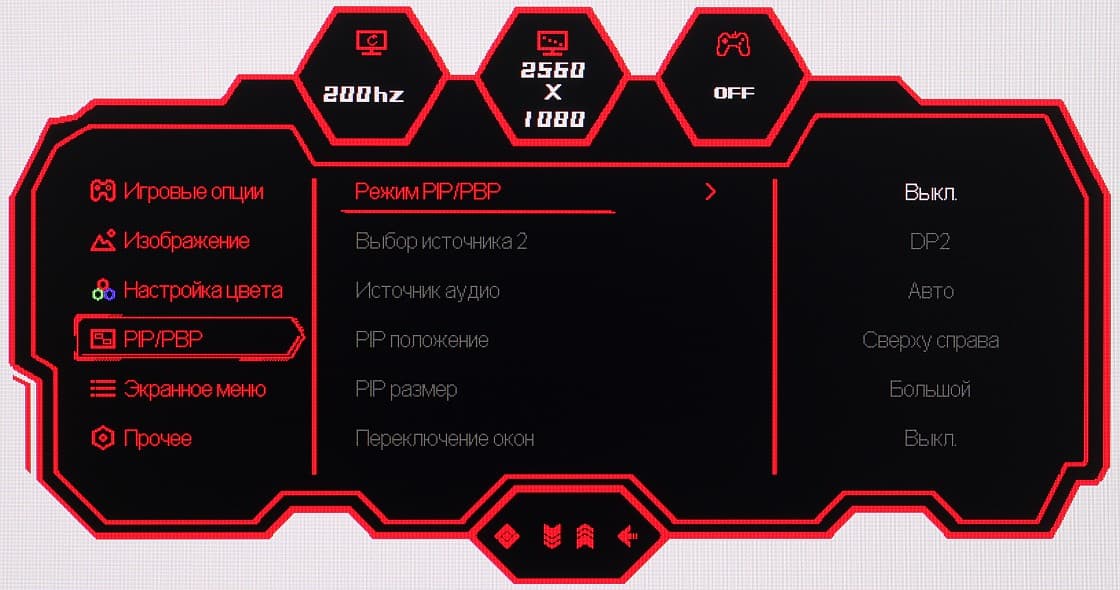 В режиме Авто монитор сам выбирает подходящий режим. Присутствуют функции картинка-в-картинке (PIP) и картинка-рядом-с-картинкой (PBP). В режиме PIP выбирается положение дополнительного окна (в одном из четырех углов), а также его размер (из трех возможных). В режиме PBP можно получить два изображения 1280×1080 с выводом точка в точку от независимых источников с заполнением всей области отображения.