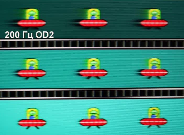 Есть режим со вставкой темного кадра (черным он в данном случае не является) с названием MPRT. Зависимости яркости (вертикальная ось) от времени (горизонтальная ось) когда эта функция включена приведена на правой половине рисунка выше. Четкость в движении действительно повышается (и производитель может указывать невероятные 1 мс с оговоркой, что это характеристика MPRT), но на динамичной картинке появляются артефакты, о чем будет рассказано ниже, а из-за мерцания с частотой максимум в 200 Гц данный режим рекомендуется использовать с осторожностью, так как мерцание может приводить к повышенной утомляемости глаз. К тому же при включении этого режима сильно снижается яркость (до 142 кд/м²), что также снижает его ценность.