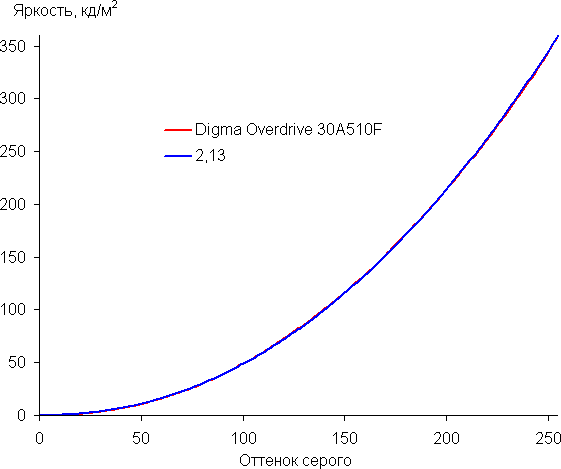 Аппроксимация полученной гамма-кривой дала показатель 2,13, что немного ниже стандартного значения 2,2, при этом реальная гамма-кривая мало отклоняется от аппроксимирующей степенной функции: