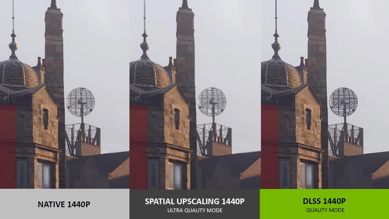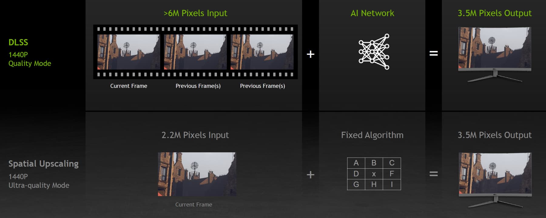 Технология DLSS использует нейросеть, натренированную на большом объеме качественных изображений с разрешением 16K и суперсэмплингом, и на их примере искусственный интеллект учится, как из меньшего разрешения восстанавливать качественную картинку — он «знает», как должно выглядеть итоговое изображение. Ну а простые алгоритмы пространственного масштабирования просто сэмплируют результат рендеринга меньшего разрешения в более высокое и увеличивают резкость постфильтрацией, которая не добавляет деталей, а только усиливает локальную контрастность. Качество выходного изображения при этом получается не слишком высоким.