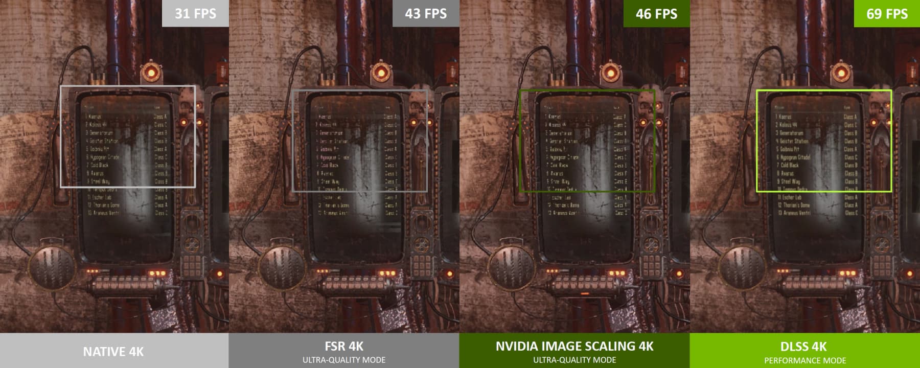 С качеством разобрались, результат работы DLSS Performance не хуже FSR Ultra Quality или NIS 77%, осталось лишь рассмотреть производительность всех рассмотренных выше техник масштабирования — а ну как DLSS не настолько качественнее, насколько требовательнее к вычислительной мощности? Или вдруг в FSR/NIS на видеокартах GeForce RTX вообще нет смысла, если схожий по качеству режим DLSS обеспечивает бо́льшую производительность? Сейчас во всем этом разберемся.