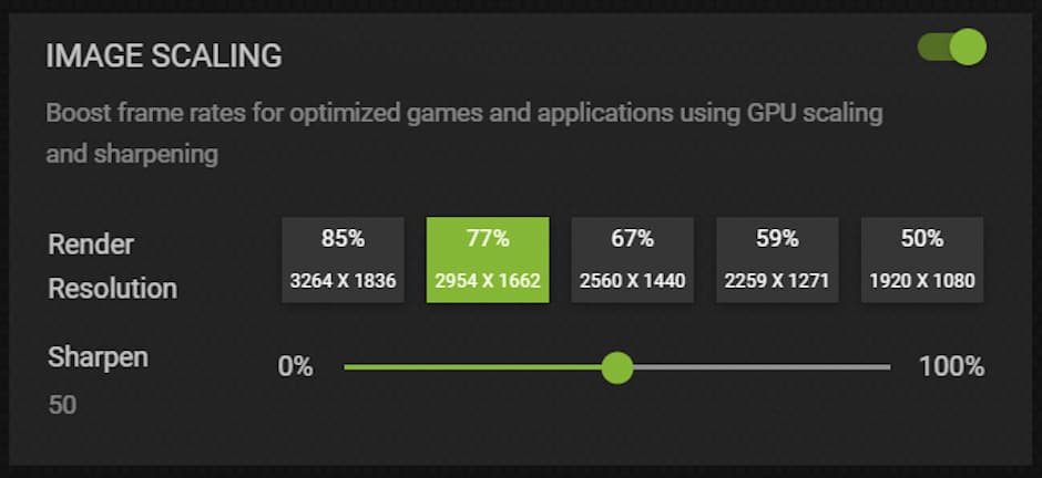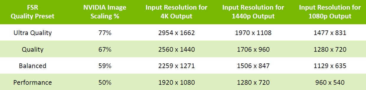 Как именно работает NIS? Да точно так же, как и FSR, при помощи простого алгоритма переводя изображение низкого разрешения в высокое. И так уж сложилось, что для самых распространенных разрешений (1920×1080, 2560×1440 и 3840×2160), современные техники масштабирования имеют устоявшиеся масштабные ряды для увеличения разрешения, что удобно для сравнения разных методов. К примеру, FSR Ultra Quality для 2560×1440 нужно сравнивать с Nvidia Image Scaling 77% (или в разрешении 1970×1108 пикселей, кому как удобнее), ну и так далее.