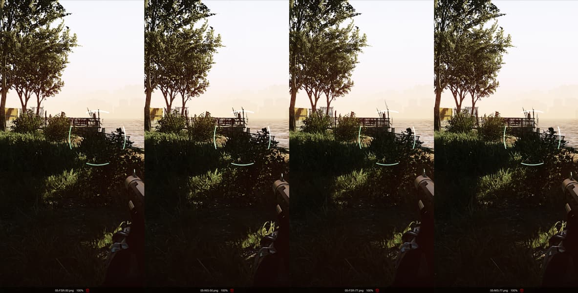 Результат очень похожий как для пары FSR Performance (он же 50%) против NIS 50%, так и для FSR 77% против NIS 77%, что и требовалось доказать и показать. Поэтому далее мы будем сравнивать лишь родное разрешение (в Crysis 2 применяется сглаживание SMAA 2TX — метод, также использующий временну́ю компоненту) с DLSS и NIS, так как между NIS и FSR просто нет разницы. И если далее мы пишем NIS, то подразумеваем и FSR тоже.