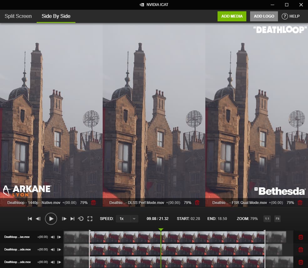 Важный момент для честного сравнения качества картинки: далеко не все артефакты и детали можно оценить по статичным скриншотам или их участкам, многие моменты желательно сравнивать по видеофрагментам. И очень полезно, что для удобного сравнения изображений и видеороликов компания Nvidia выпустила утилиту Image Comparison & Analysis Tool (ICAT), которая позволяет сравнивать несколько скриншотов или видеороликов в двух режимах: с наложением друг на друга и слайдером или рядом друг с другом, с возможностью увеличения фрагментов, выравнивания картинок и видеороликов по картинке и времени.