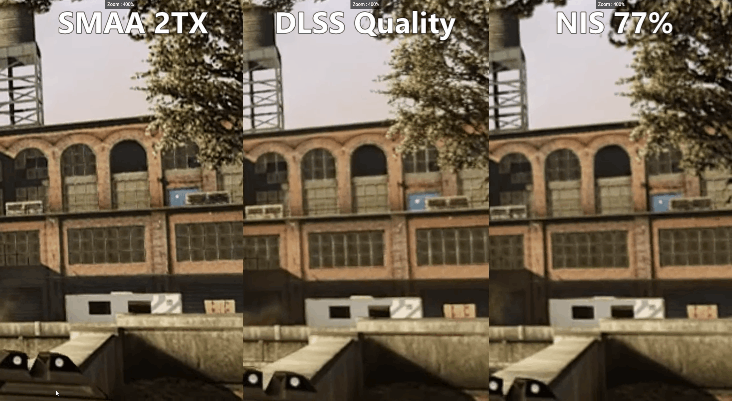 Рассмотрим отличия результатов масштабирования при помощи одного и того же метода пространственного масштабирования NIS 50% (примерно то же самое, что и FSR Performance) и NIS 77% (аналогичен FSR Ultra Quality) от картинки родного разрешения со сглаживанием: