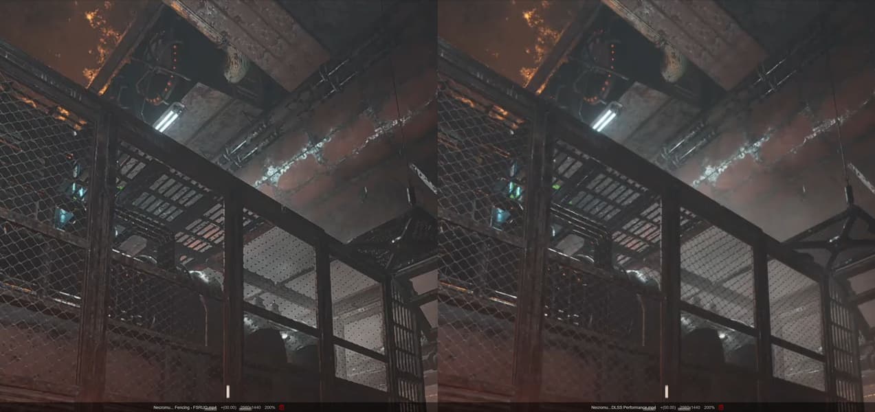 Следующий пример Nvidia из игры Necromunda тоже наглядно показывает разницу в качестве между DLSS и FSR/NIS. Более продвинутый метод DLSS даже позволяет использовать режим худшего качества Performance и при этом достигает как минимум уровня качества методов пространственного масштабирования при самом высоком — FSR Ultra Quality или NIS 77%. И так как DLSS дает лучшее качество в целом, можно использовать менее качественный режим для дополнительного прироста производительности — при том же уровне качества картинки, а то и лучшем.