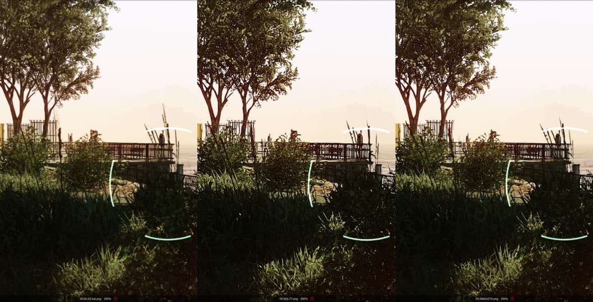 Методы пространственного масштабирования NIS и FSR не используют никаких усложняющих процесс элементов и довольно прямы и просты, поэтому за счет повышения производительности выходное качество страдает куда сильнее. Итоговая картинка после подобных алгоритмов масштабирования вверх далека по качеству от родного разрешения, особенно в режимах наибольшей производительности, вроде 50% от выходного разрешения. А главное — из-за отсутствия временно́й компоненты (использование данных из предыдущих кадров) они страдают от артефактов, связанных с недостатком детализации и движением пикселей в кадре.
