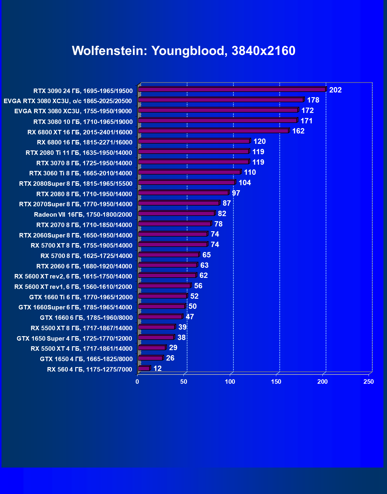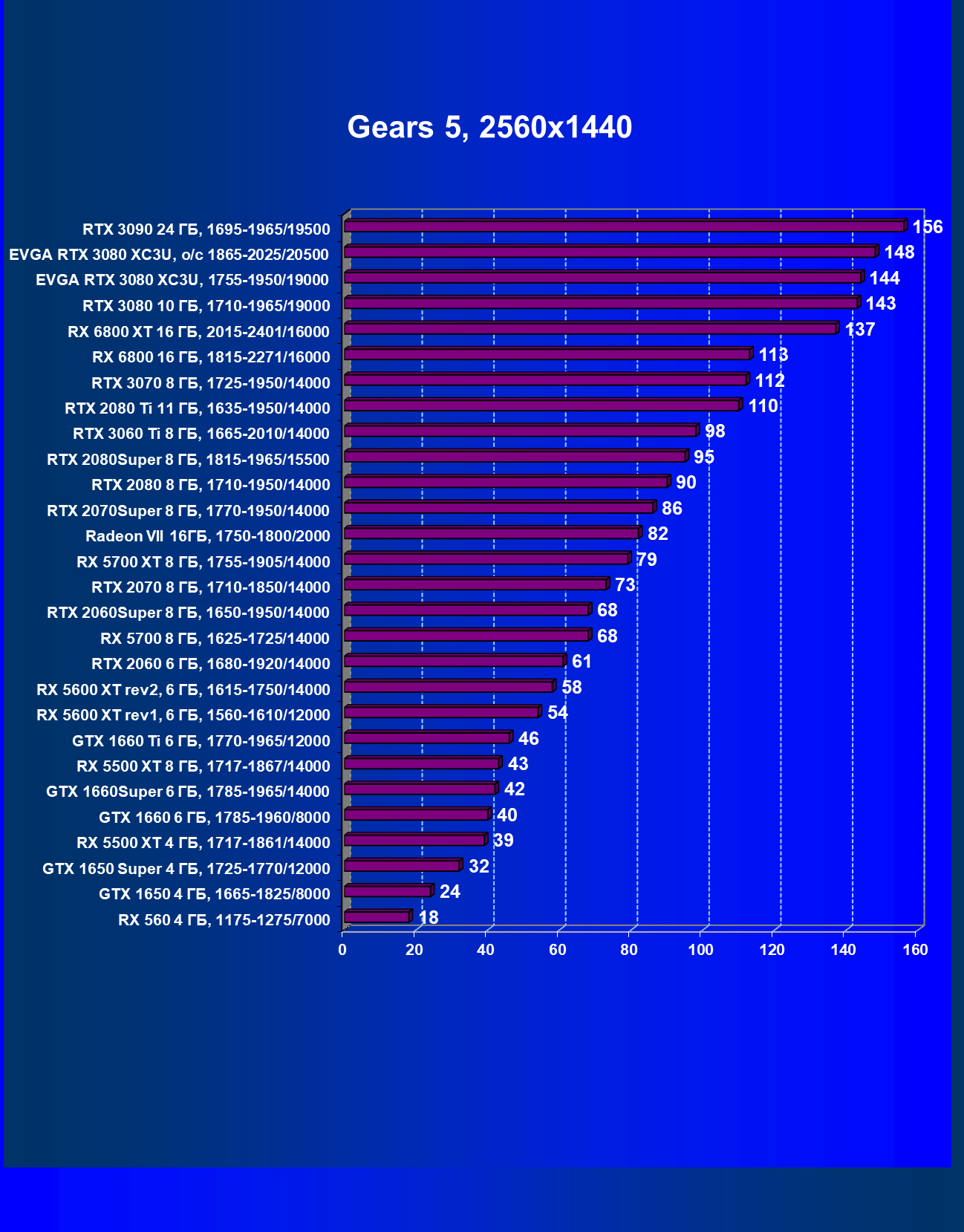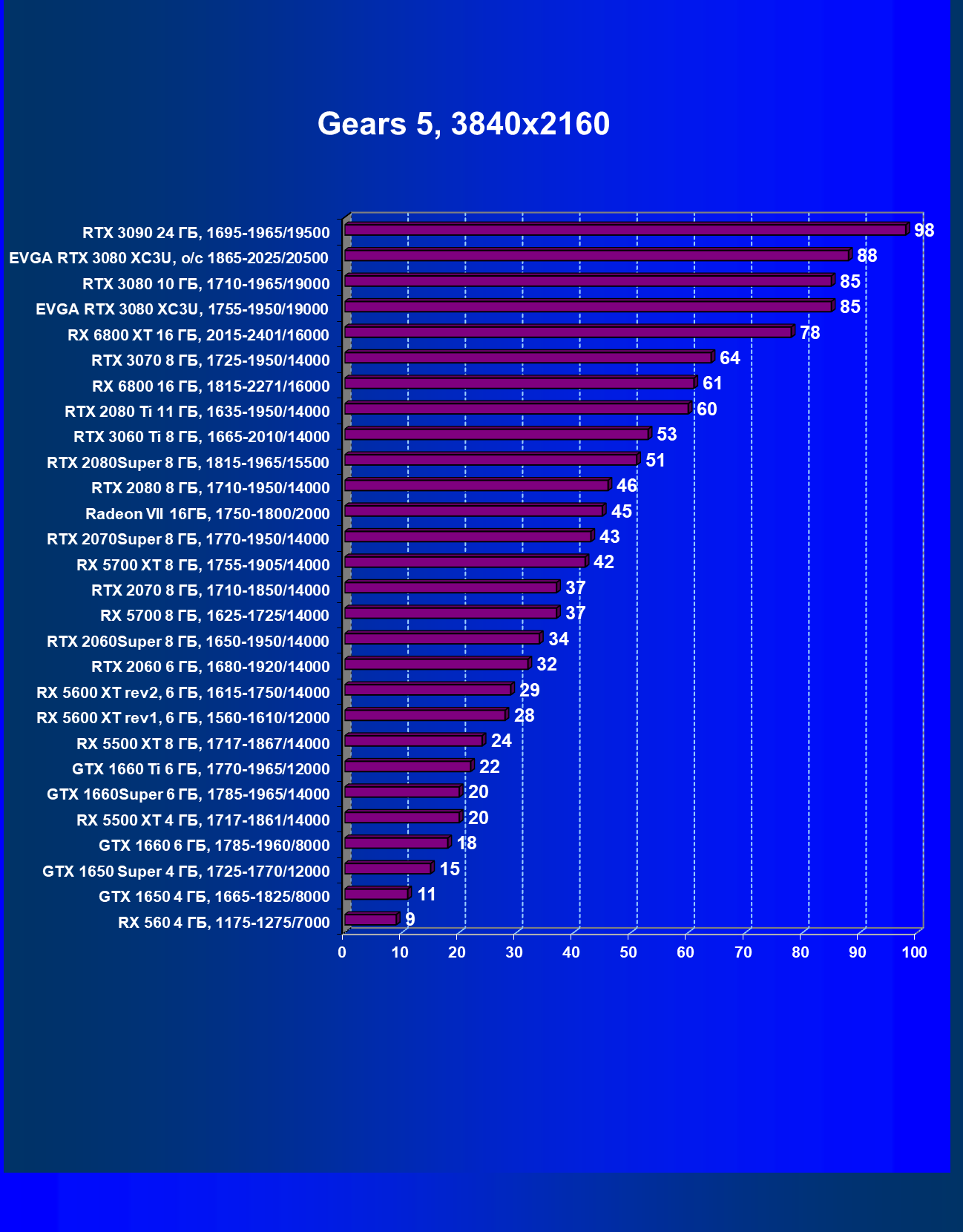 | 03 | EVGA RTX 3080 XC3U, разгон до 1865—2025/20500 | 28 | 237 | 86 000 |