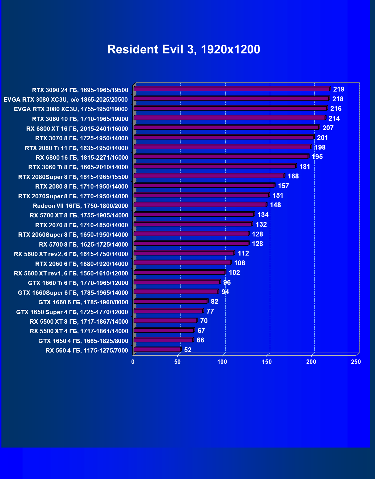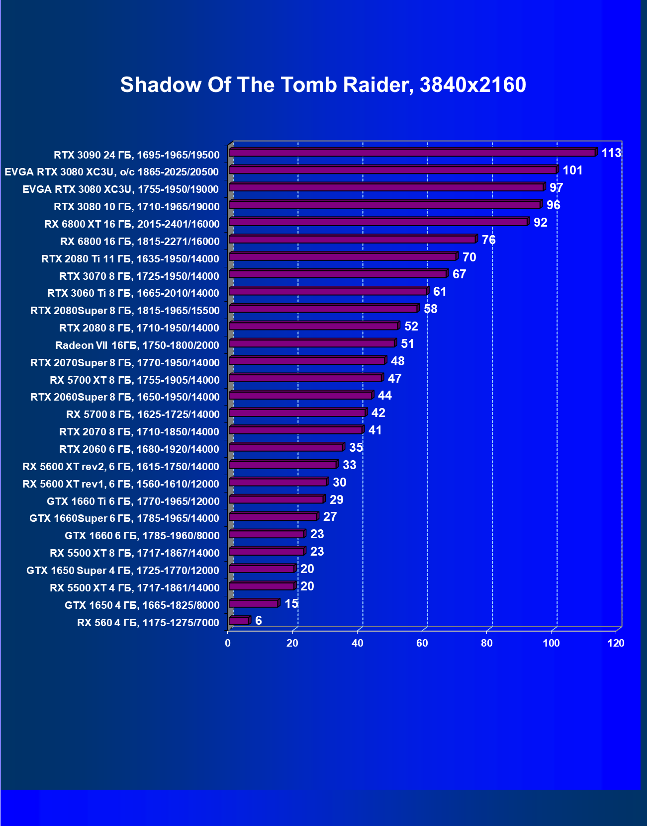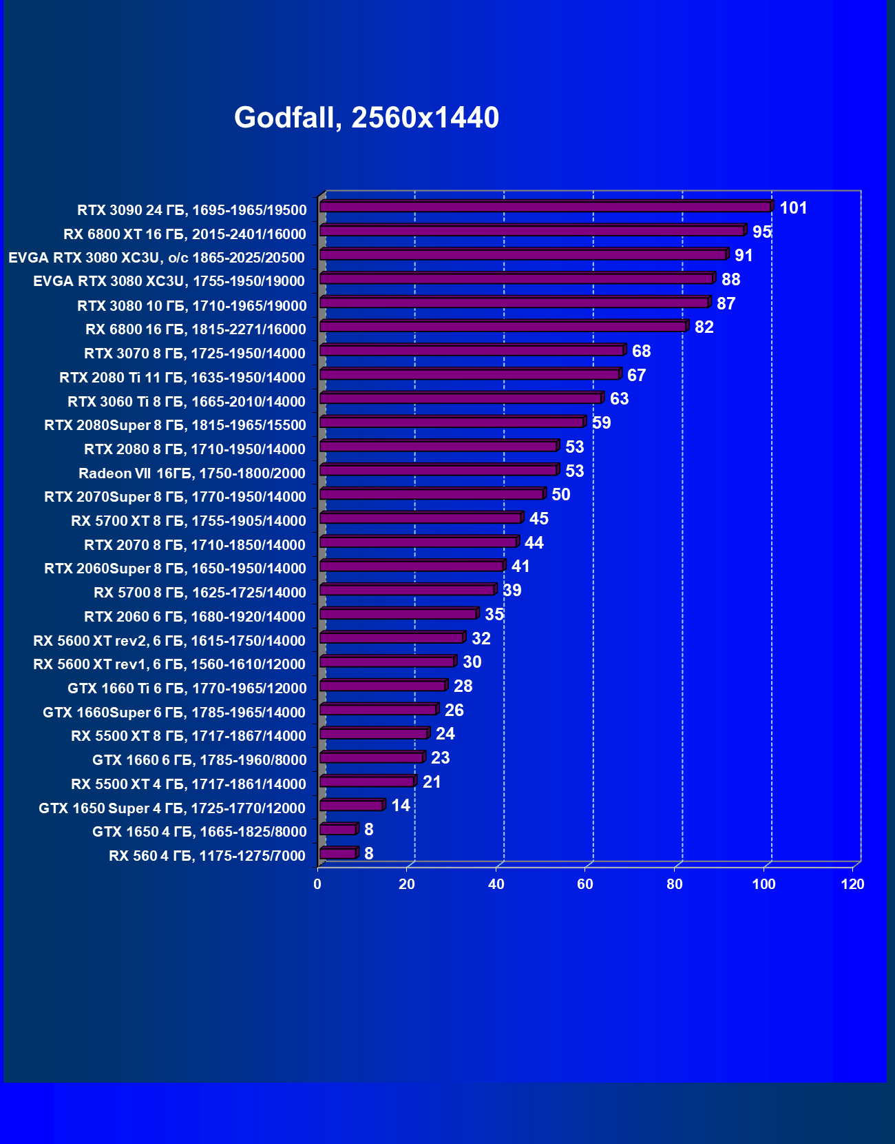 | 03 | EVGA RTX 3080 XC3U, разгон до 1865—2025/20500 | 28 | 237 | 86 000 |
