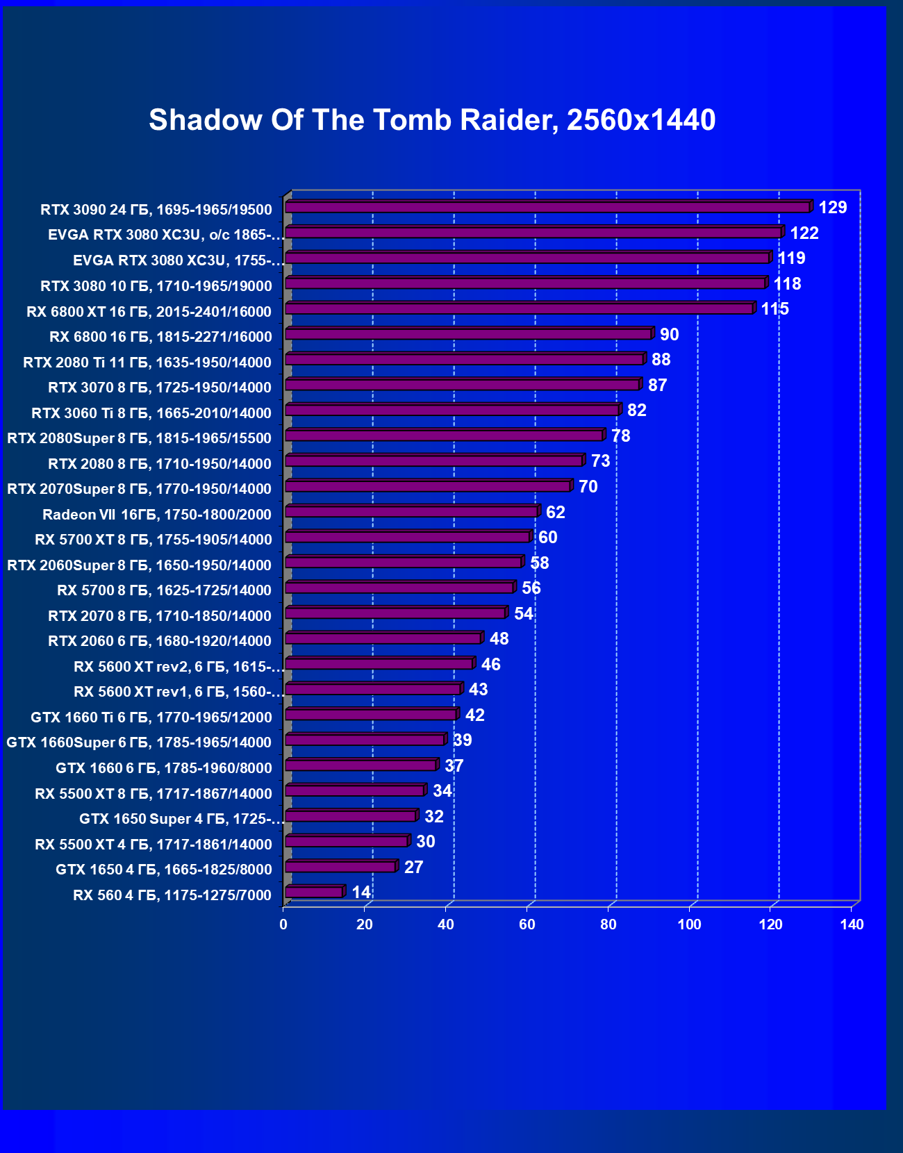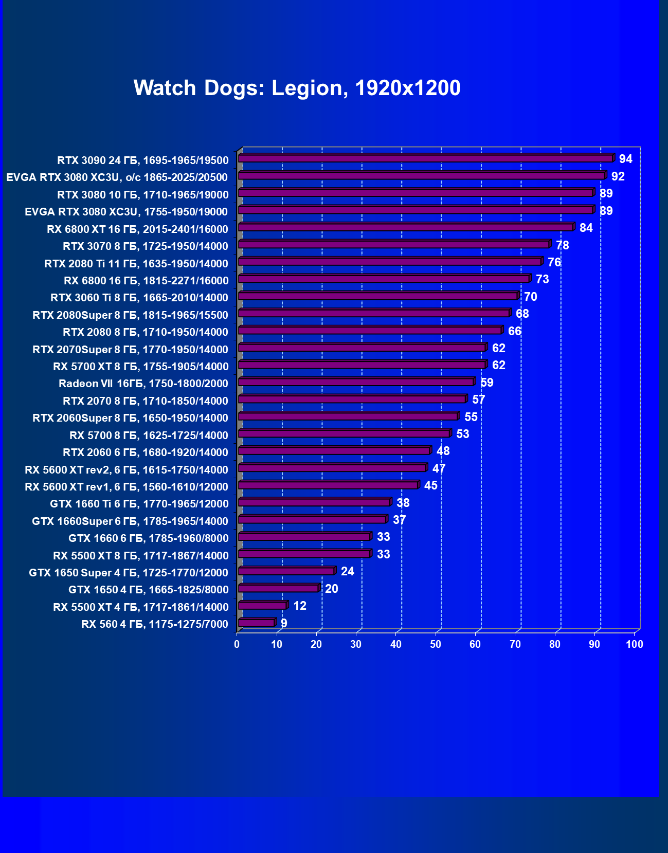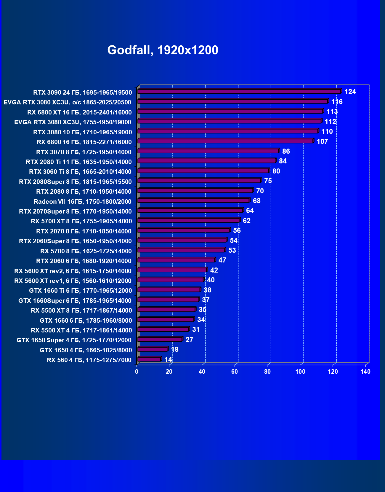 | 02 | EVGA RTX 3080 XC3U, разгон до 1865—2025/20500 | 1170 | 136 | 86 000 |