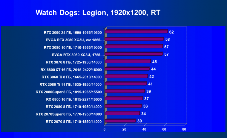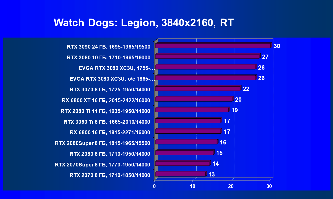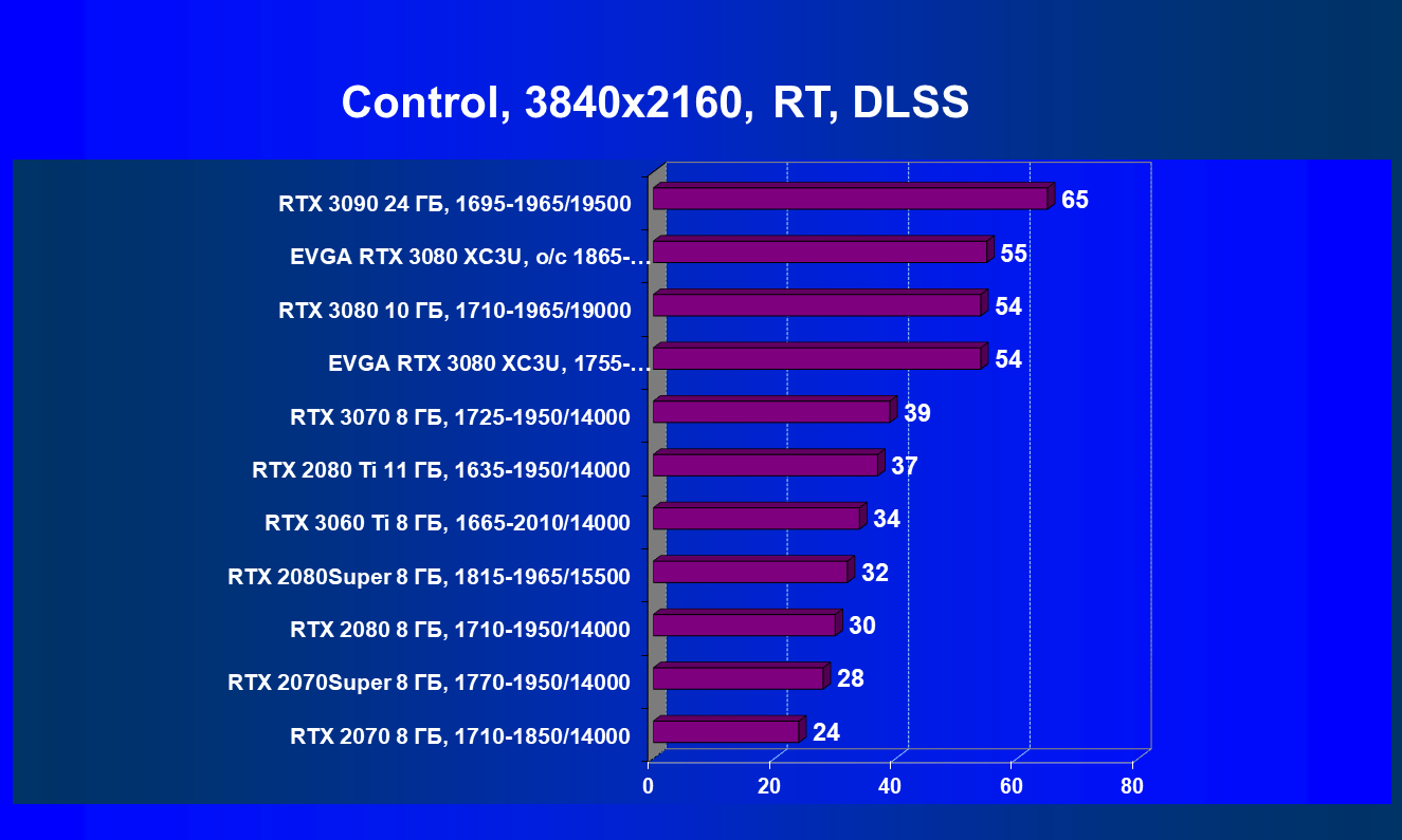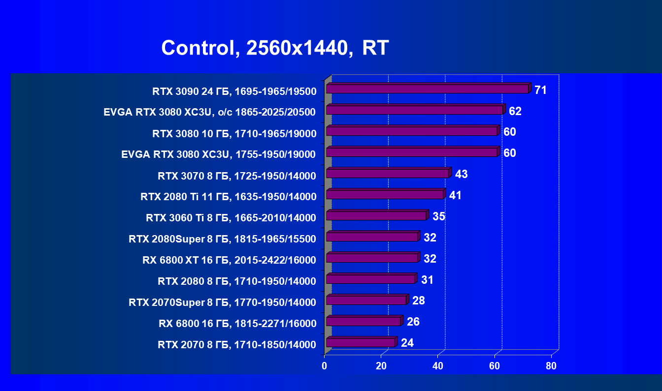 | 04 | EVGA RTX 3080 XC3U, разгон до 1865—2025/20500 | 278 | 2387 | 86 000 |