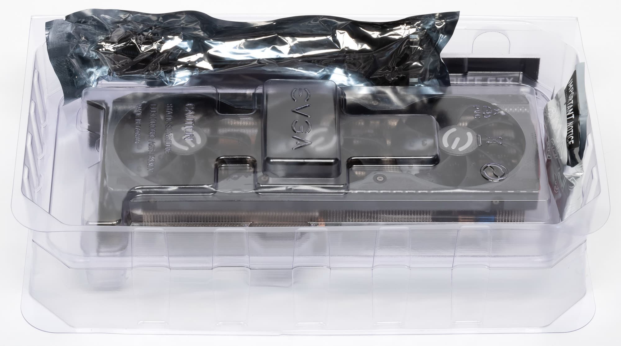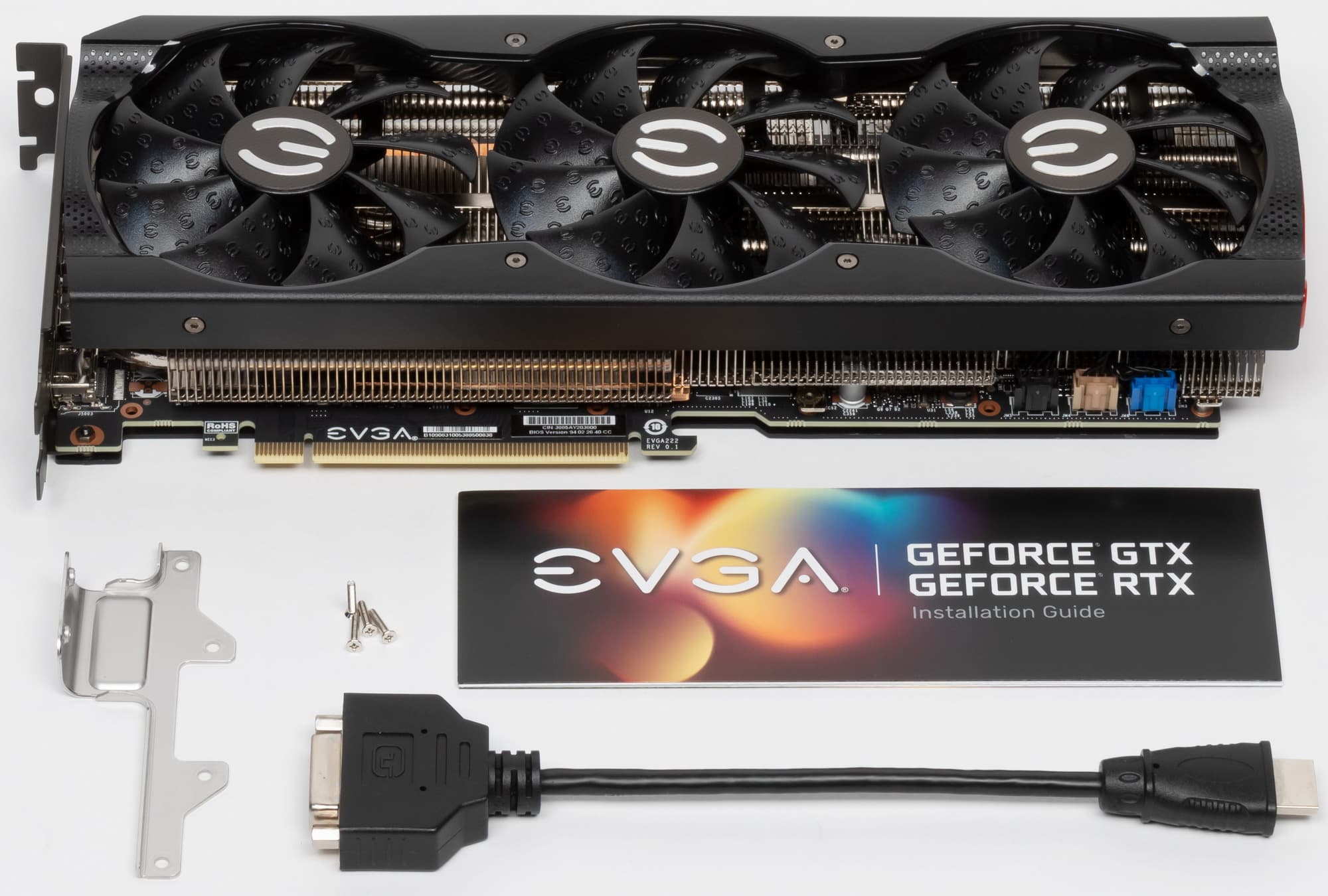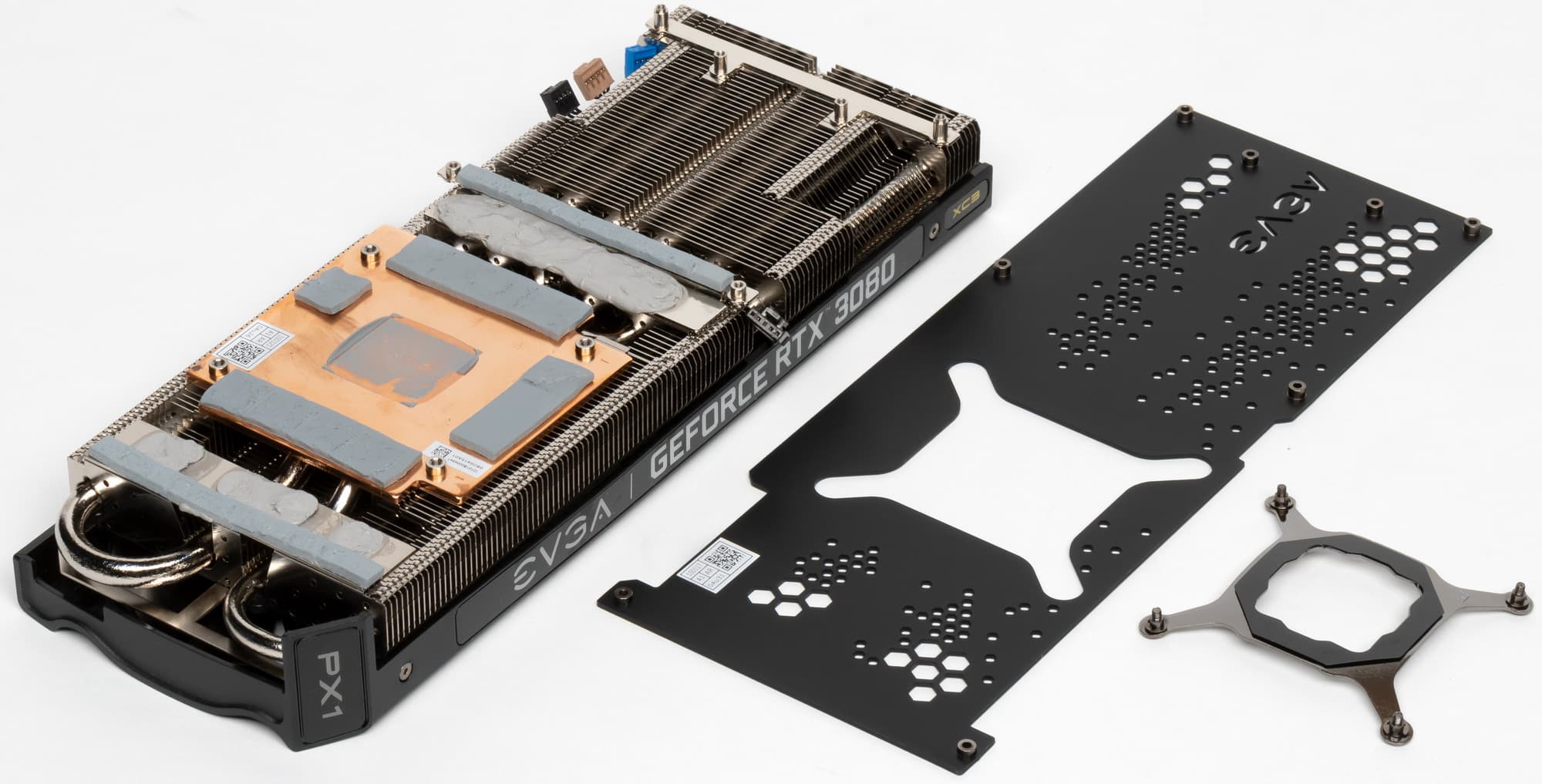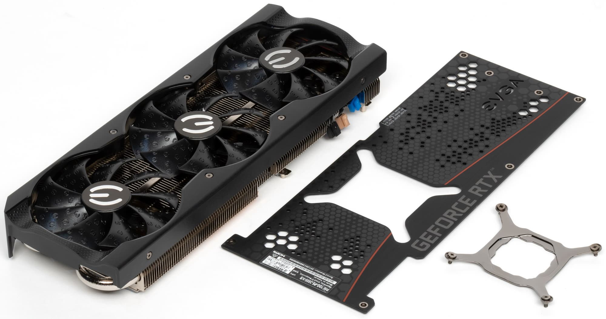 Кронштейна-подставки в комплекте у карты нет, однако есть специальная планка-брекет, которая привинчивается к задней пластине и крепит хвостовую часть карты к корпусу, если он это предусматривает (в первую очередь подразумеваются собственные корпуса EVGA, однако и у других фирм есть модели, предусматривающие крепление длинных видеокарт к перемещаемым планкам с отверстиями). Винты идут в комплекте с брекетом.
