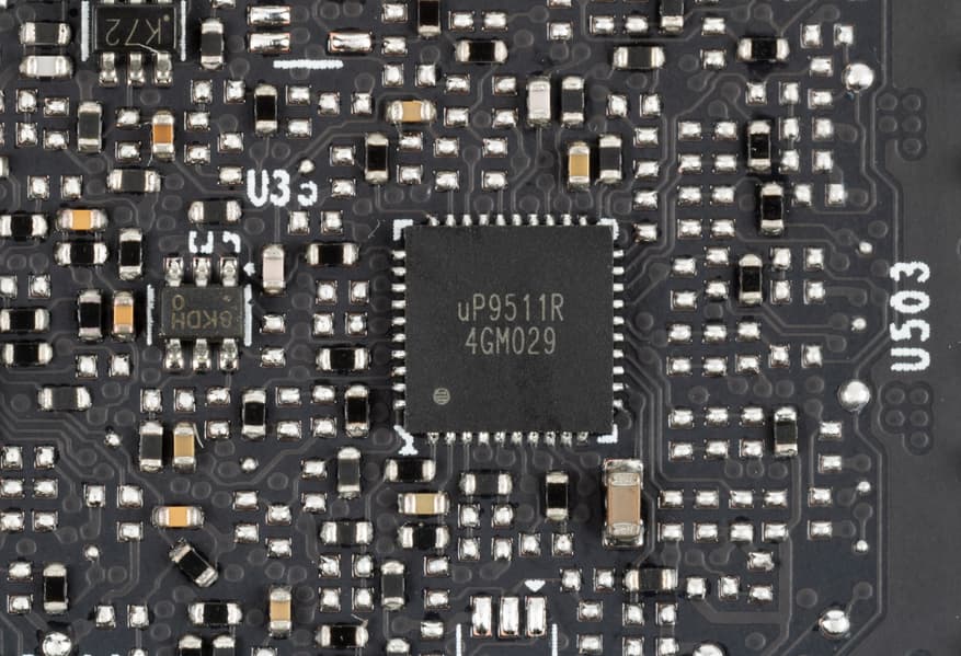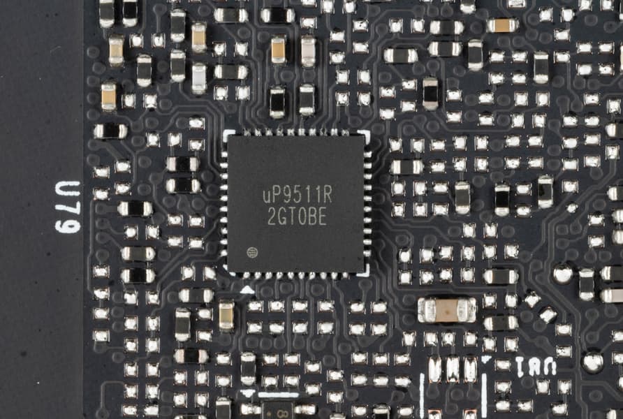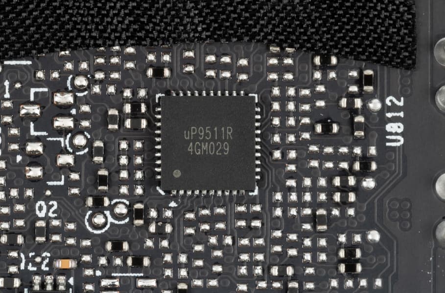 Зеленым цветом отмечена схема питания ядра, красным — памяти. При этом никаких удвоителей (даблеров) фаз нет, для управления схемой питания GPU используются два ШИМ-контроллера uP9511R (uPI Semiconductor), каждый из которых способен управлять максимум 8 фазами (реализовано 8+5). Оба расположены на оборотной стороне платы.