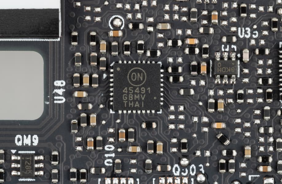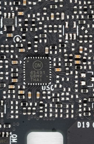 Также имеются два контроллера NCP45491 (On Semiconductor), отвечающие за мониторинг карты (слежение за напряжением и температурой). Они расположены на лицевой и оборотной сторонах PCB.