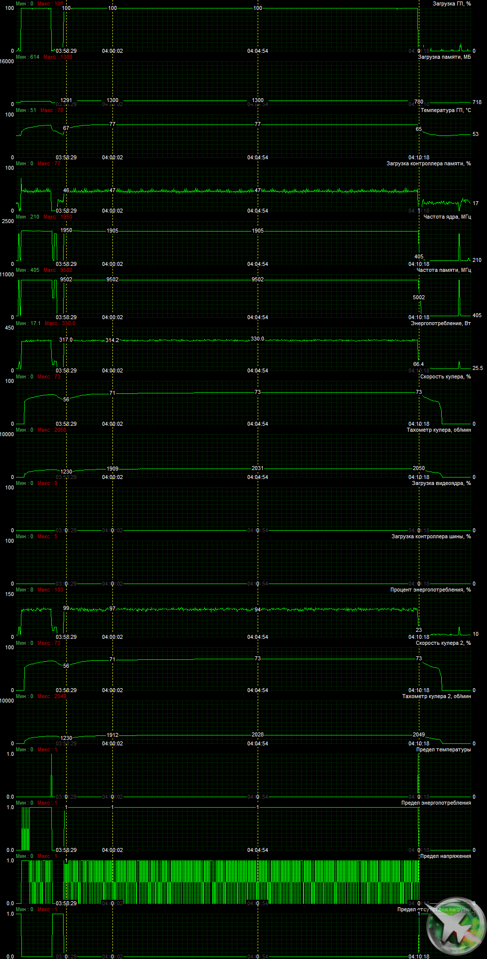 После 6-часового прогона под нагрузкой максимальная температура ядра не превысила 77 градусов, что является приемлемым результатом для видеокарт флагманского уровня. Энергопотребление карты доходило до 330 Вт. Кулер при этом отнюдь не был тихим.