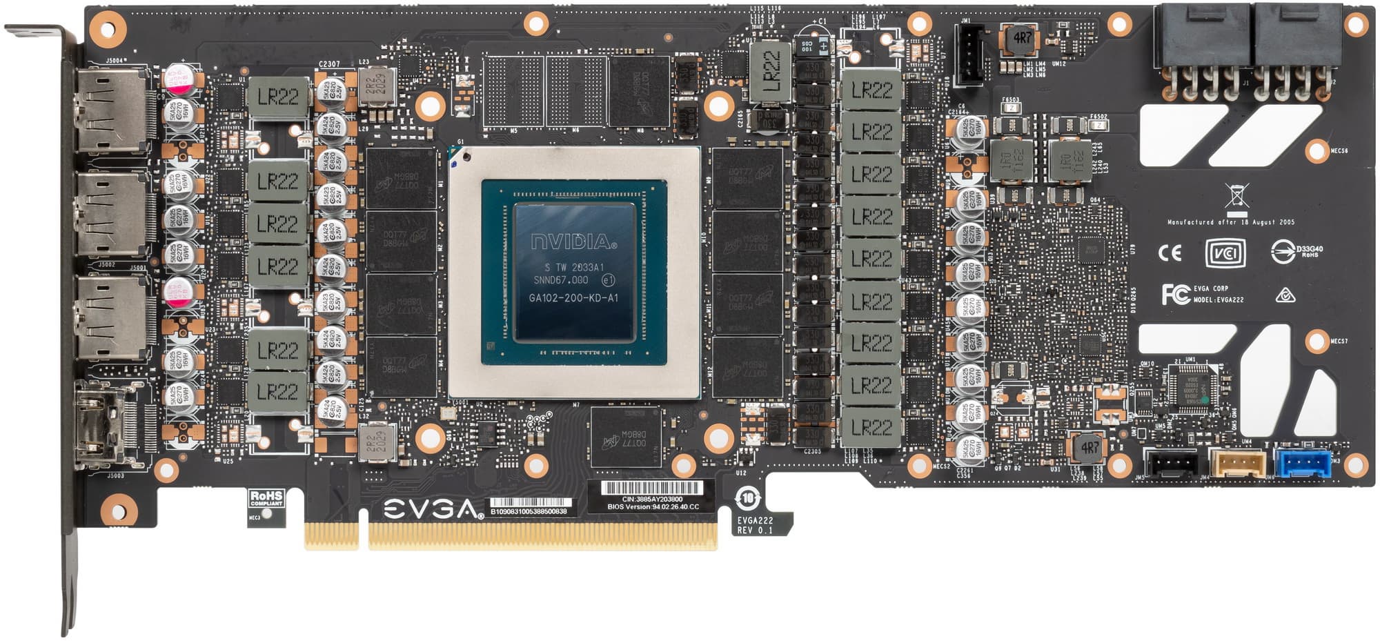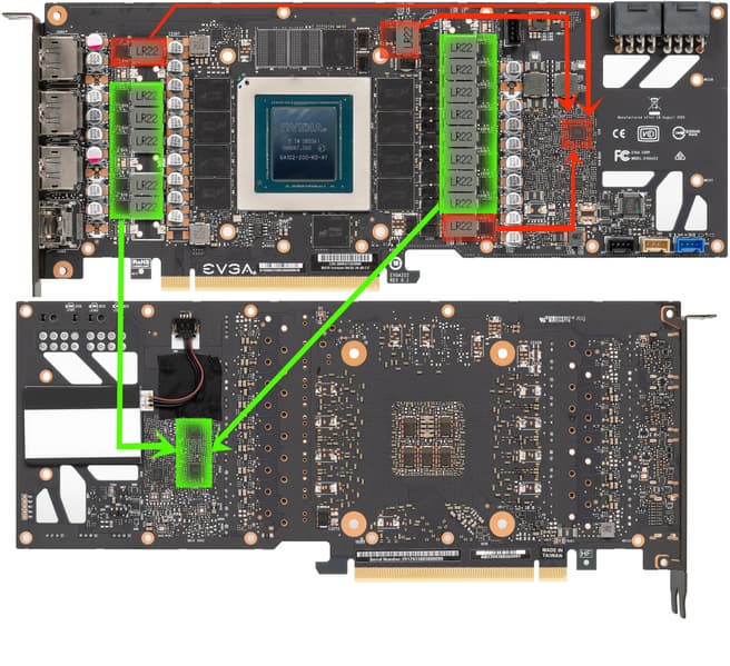 Суммарное количество фаз питания у Nvidia GeForce RTX 3080 Founders Edition — 18: 15 фаз на ядро и 3 на микросхемы памяти. У карты EVGA в сумме 16 фаз, из которых 3 — на память, а 13 — на GPU.