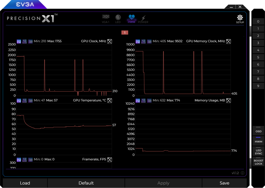 Управление работой карты обеспечивается силами фирменной утилиты EVGA Precision X1. Кстати, стоит упомянуть, что я попробовал ручной разгон и после экспериментов вышел на стабильную работу при увеличении частоты ядра на 110 МГц, а памяти — на 755 МГц. Получил при этом максимум по частотам 1865—2025/20500 МГц и прирост производительности в среднем 2,5% (в разрешении 4К — более +3% относительно референс-значений). При этом максимум энергопотребления почти не изменился и составил 332 Вт.