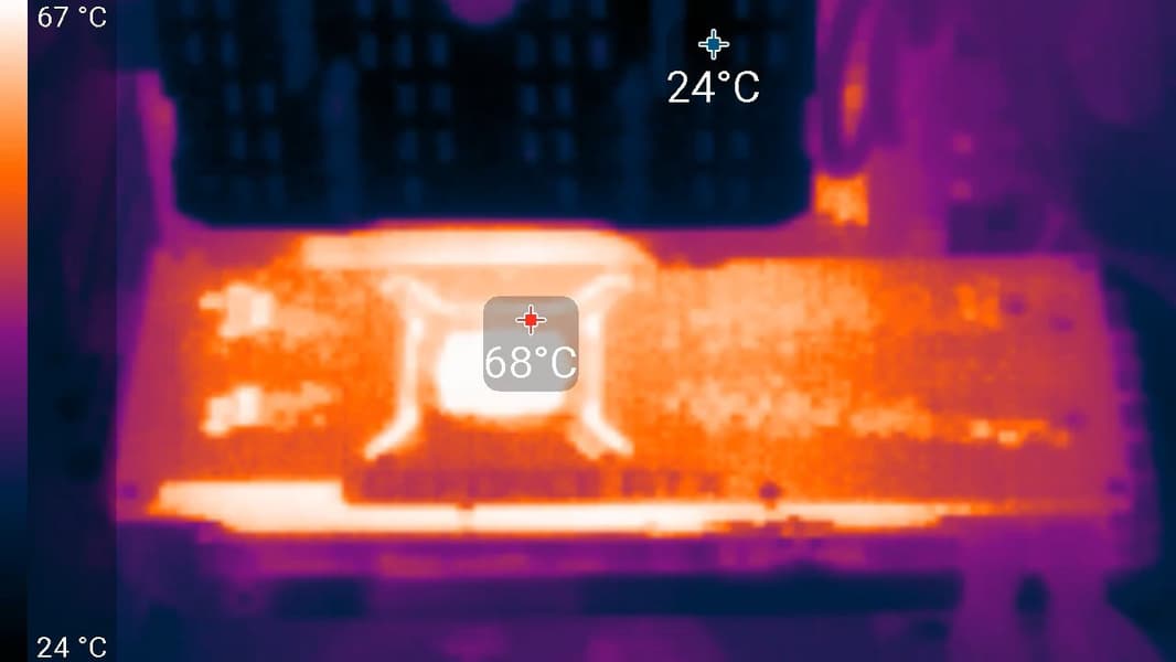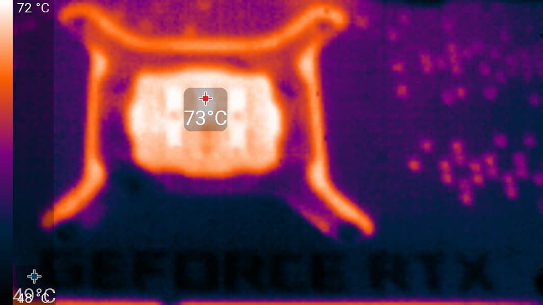 Максимальный нагрев наблюдался в центральной части PCB, в основном около ядра (а микросхемы памяти GDDR6X оказались самыми нагревающимися элементами).