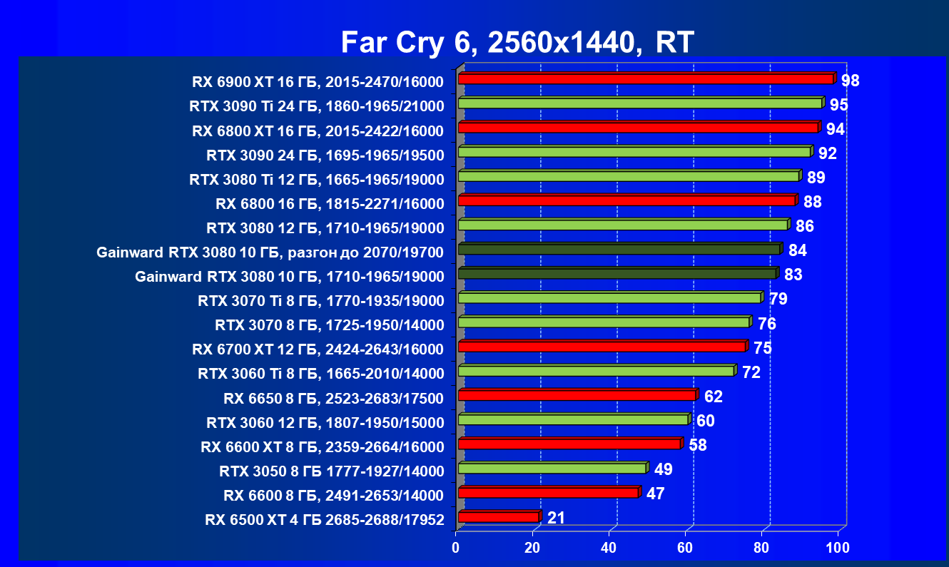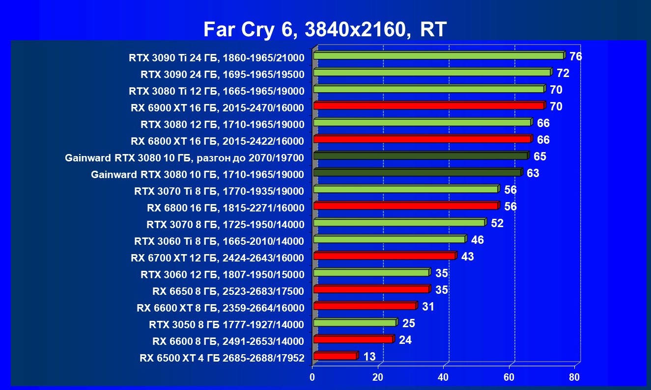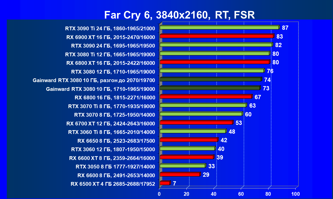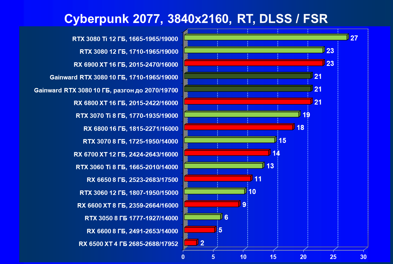 Из-за более драматичного падения производительности с RT (технология FSR помогла, но не полностью компенсировала влияние трассировки лучей на скорость) соперник в лице Radeon RX 6800 XT оказался уже ниже обеих версий RTX 3080, и уже RX 6900 XT (он и более дорогой) призван соперничать с 3080.