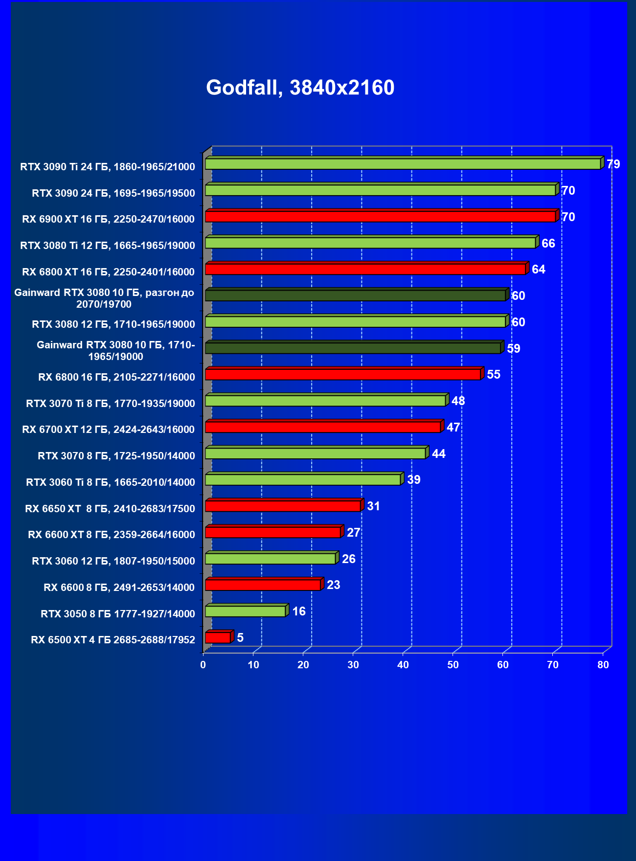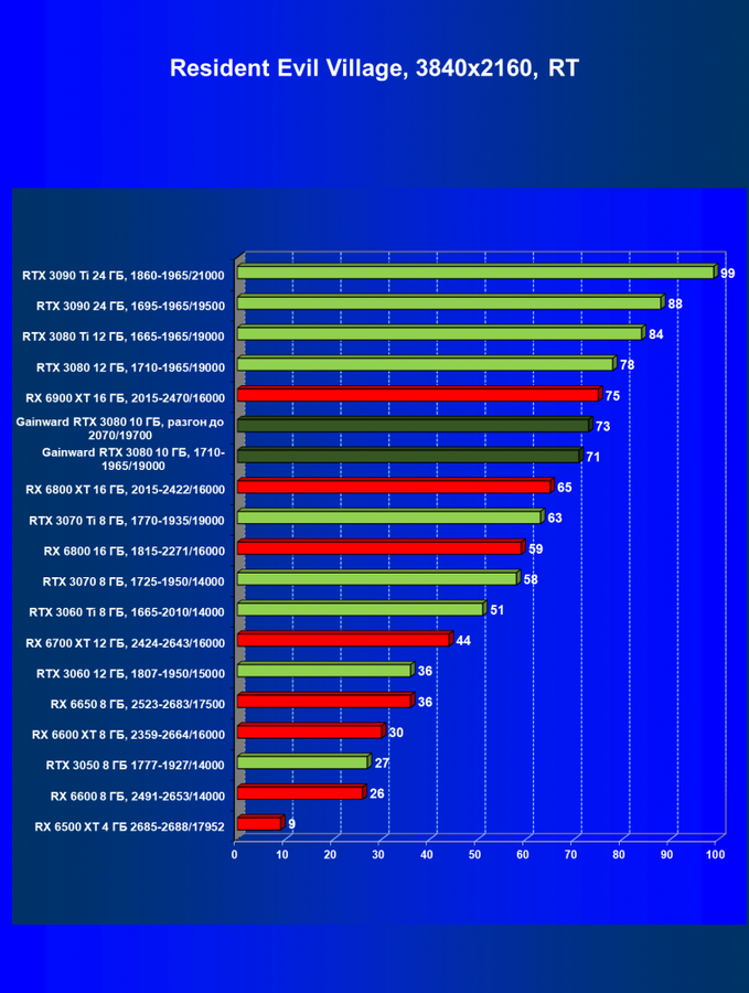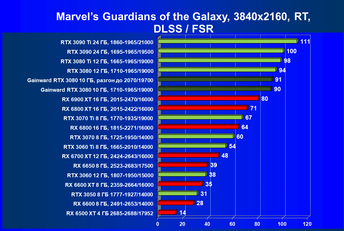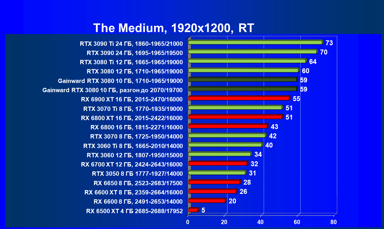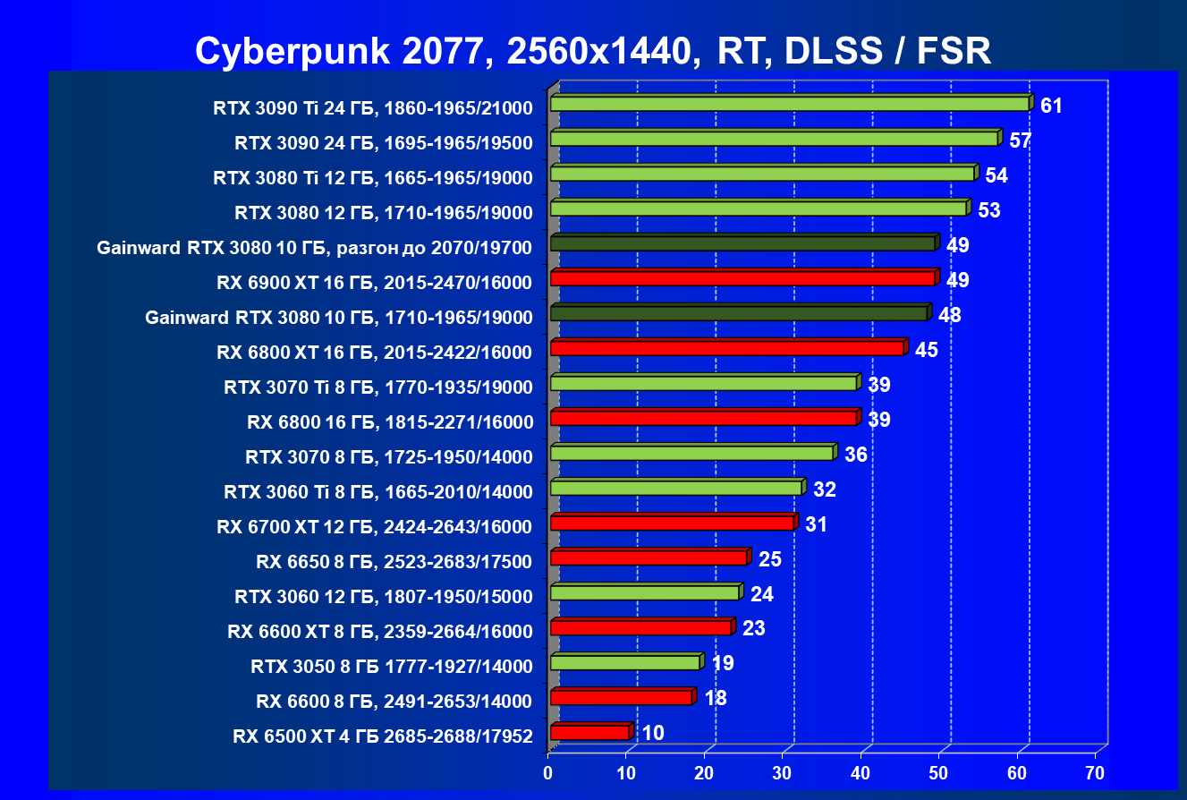 Из-за более драматичного падения производительности с RT (технология FSR помогла, но не полностью компенсировала влияние трассировки лучей на скорость) соперник в лице Radeon RX 6800 XT оказался уже ниже обеих версий RTX 3080, и уже RX 6900 XT (он и более дорогой) призван соперничать с 3080.