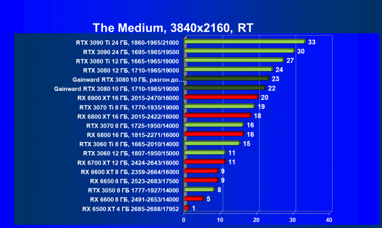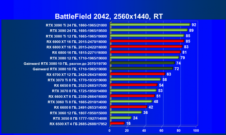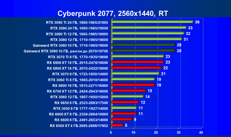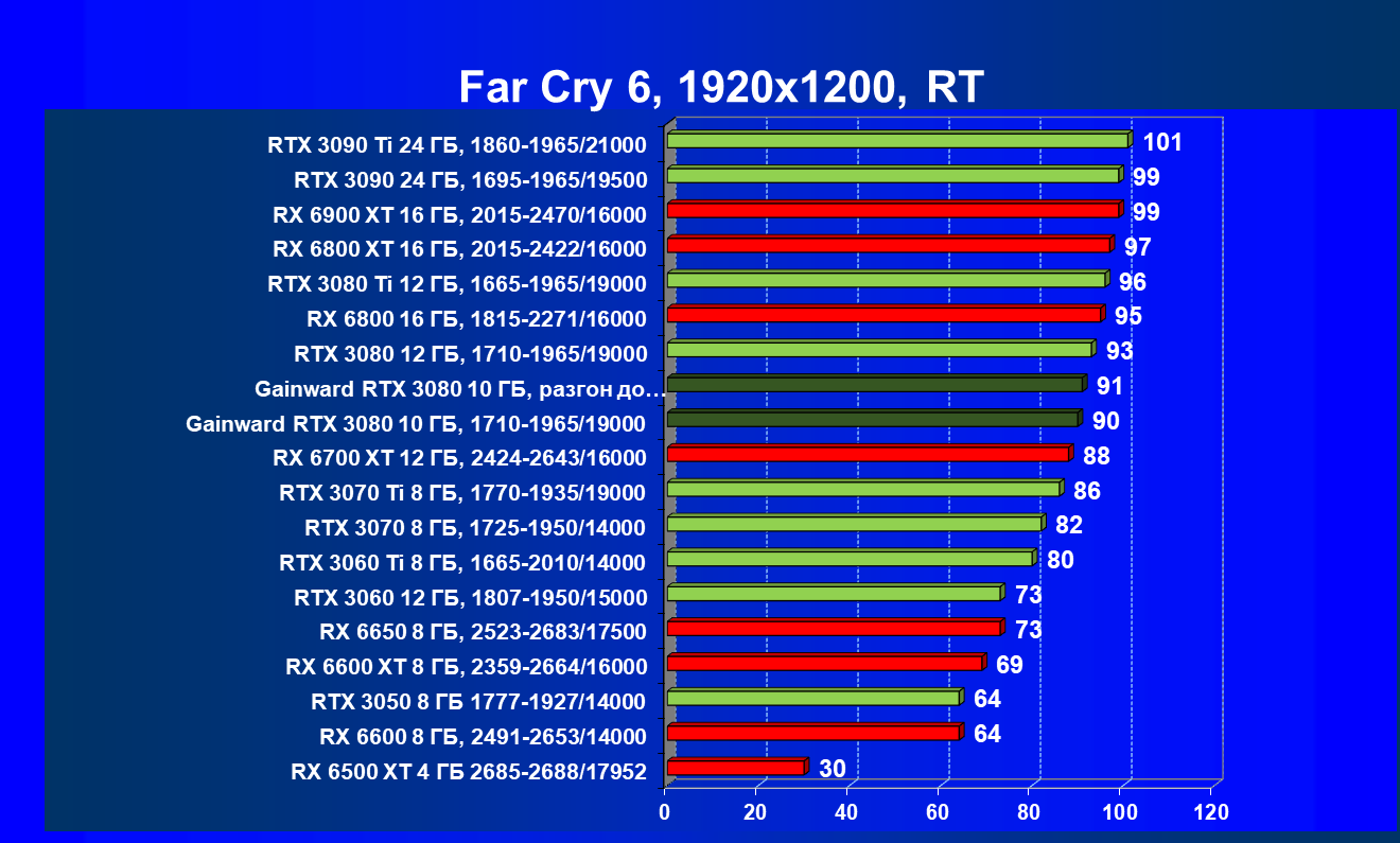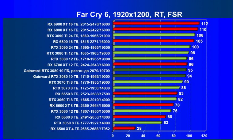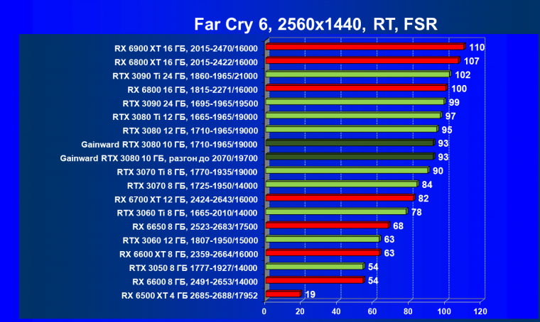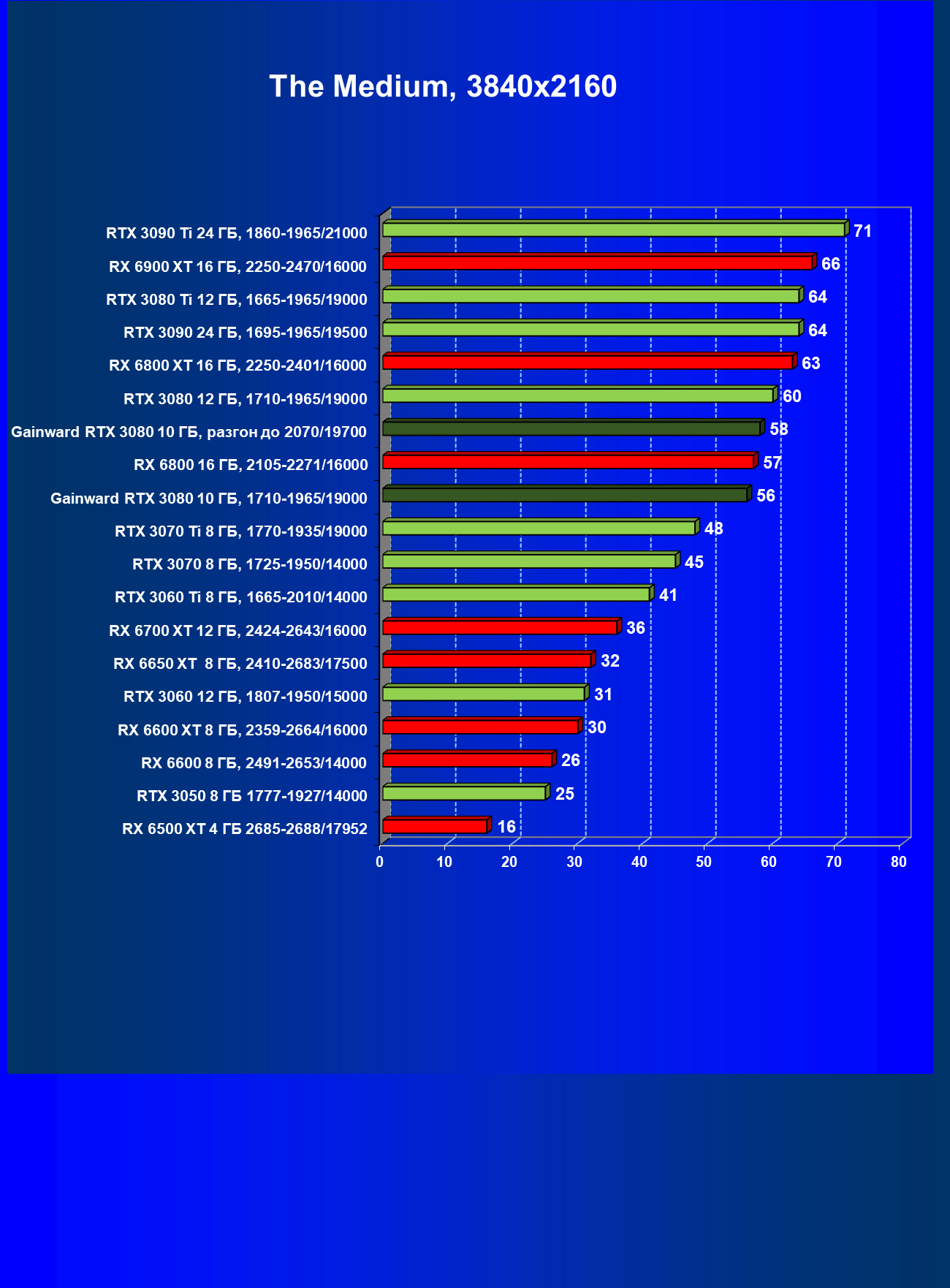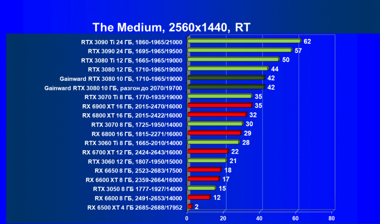 Из-за более драматичного падения производительности с RT (технология FSR помогла, но не полностью компенсировала влияние трассировки лучей на скорость) соперник в лице Radeon RX 6800 XT оказался уже ниже обеих версий RTX 3080, и уже RX 6900 XT (он и более дорогой) призван соперничать с 3080.