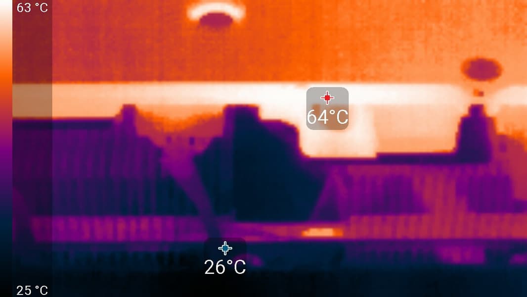 Максимальный нагрев наблюдался в центральной части PCB, в основном около преобразователей питания.
