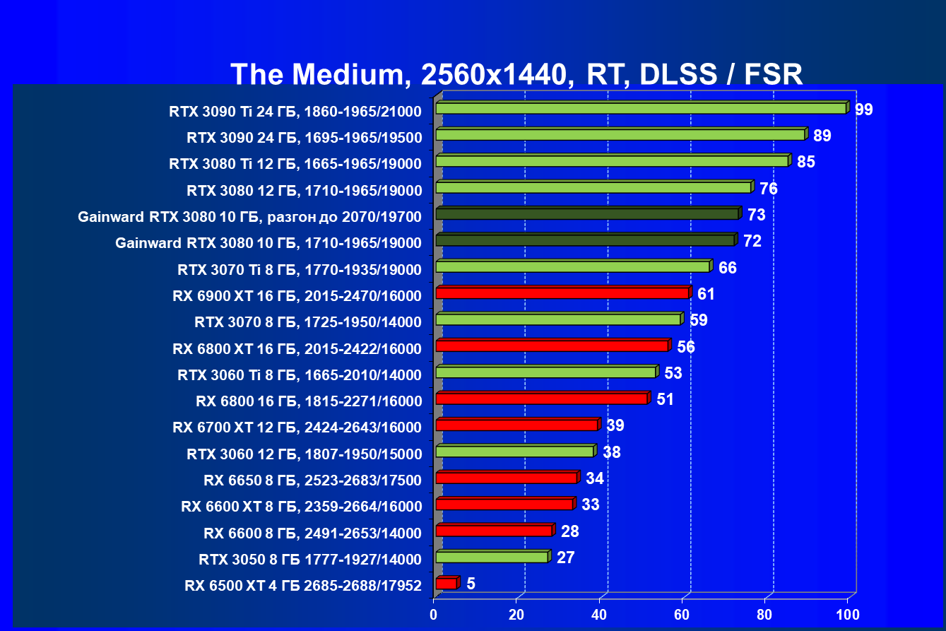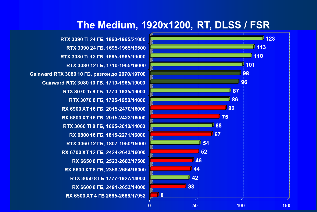 Оценки не очень сильно отличаются от предыдущих, и это потому, что все больше и больше игр с поддержкой Nvidia DLSS, когда эта технология «умного» антиалиасинга позволяет резко поднять производительность, компенсируя падение от включения RT.