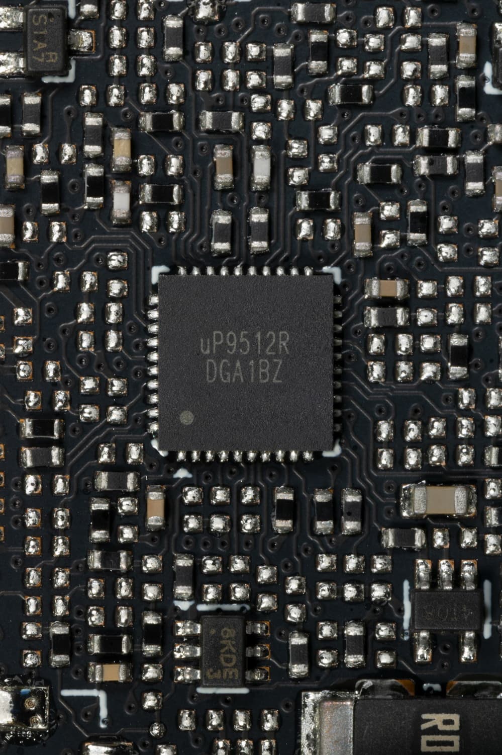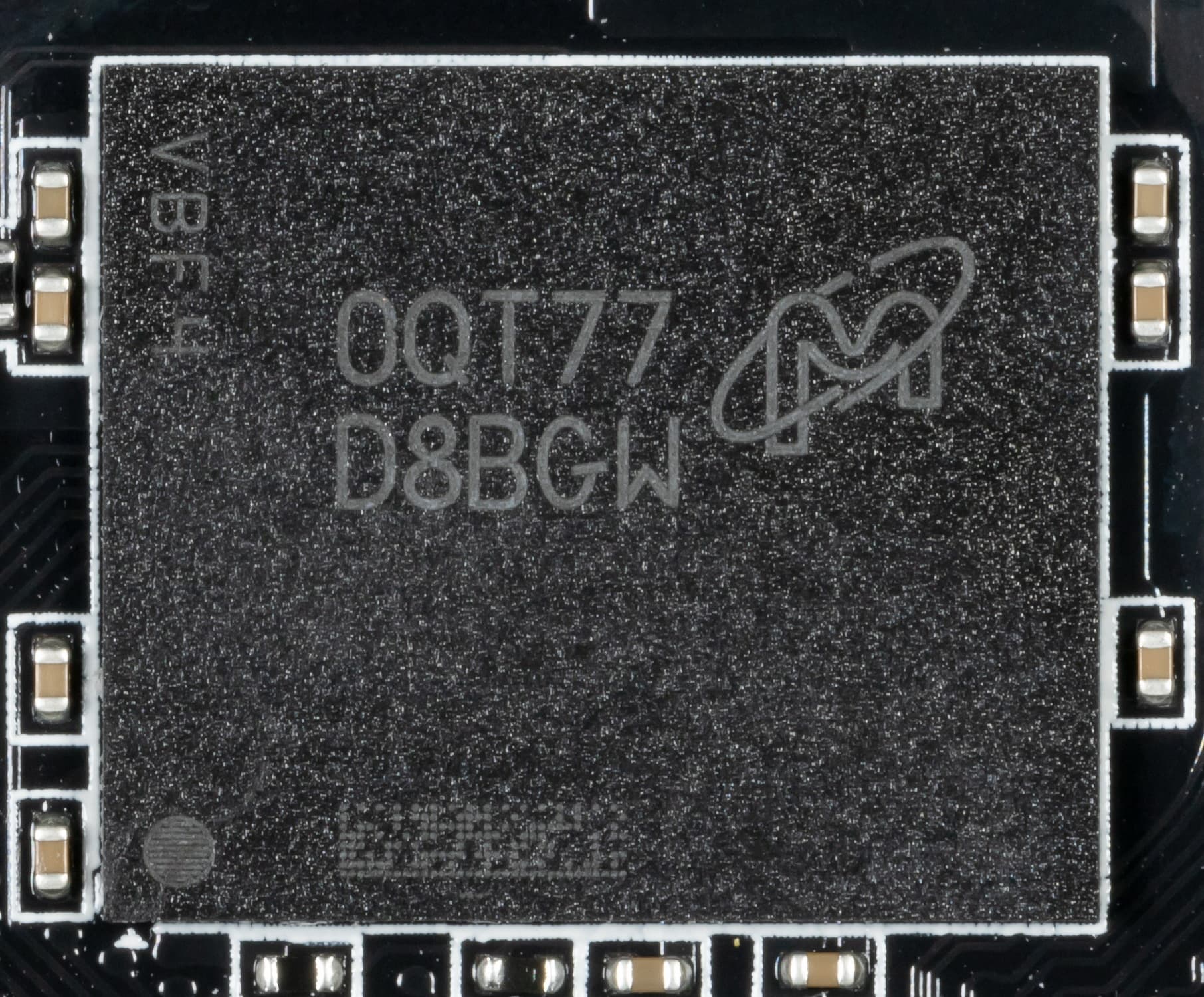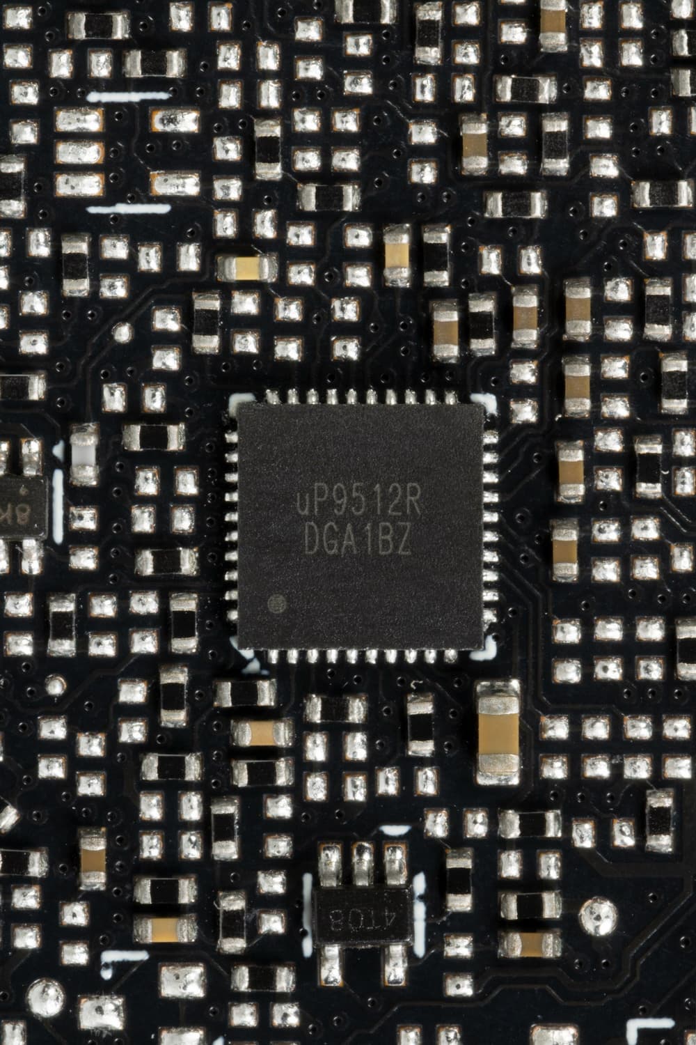 За три фазы питания микросхем памяти отвечает третий контроллер uP9512R, расположенный уже на лицевой стороне карты.