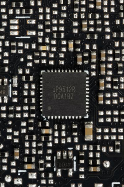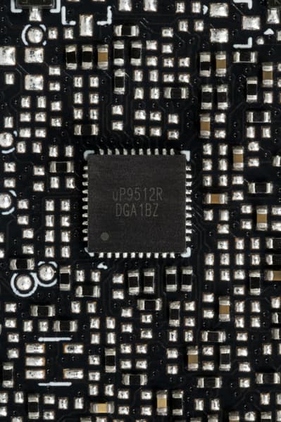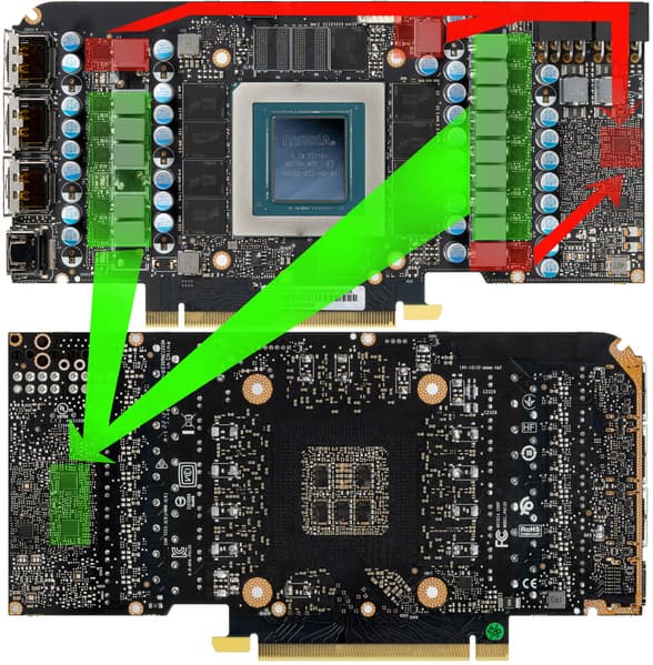 Зеленым цветом отмечена схема питания ядра, красным — памяти. 13 фаз питания GPU управляются двумя ШИМ-контроллерами uP9512R (uPI Semiconductor), расположенными на оборотной стороне PCB.