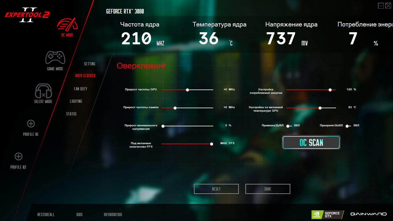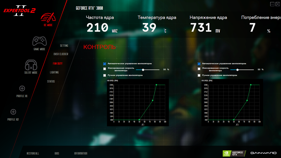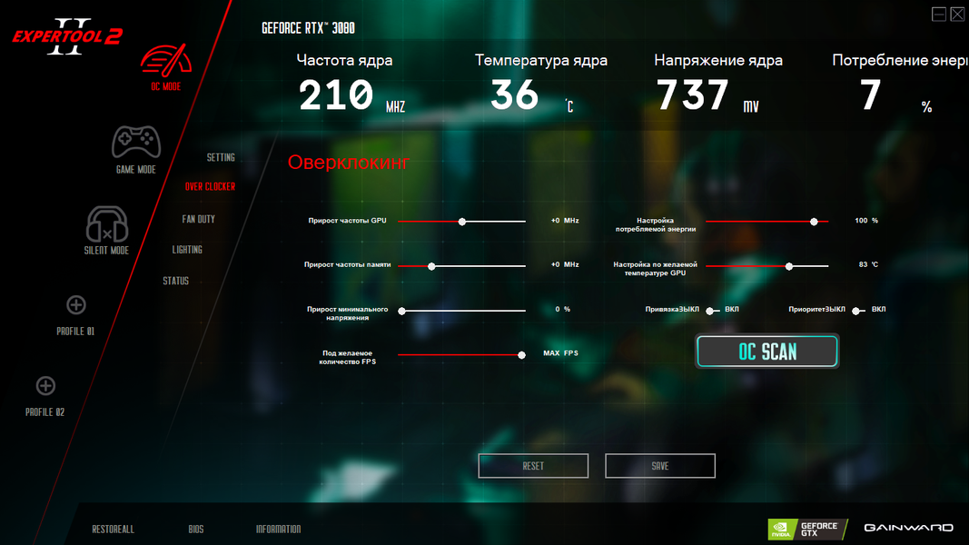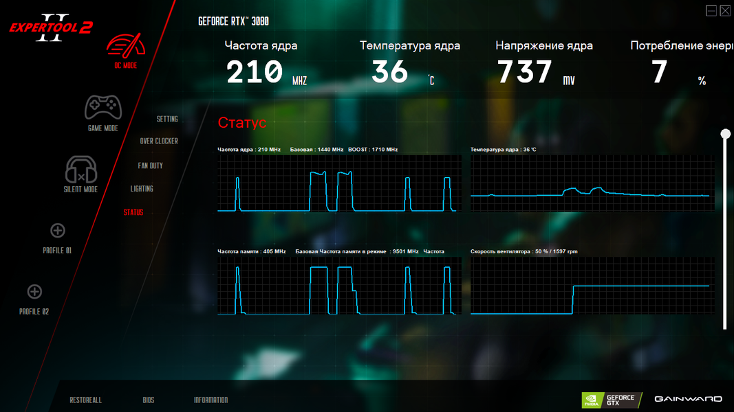 Штатные частоты памяти, а также Boost-значение частоты работы ядра в режиме по умолчанию (Game Mode) у карты Gainward равны референсным значениям, при этом максимальная частота GPU чуть ниже (1950 МГц против 1965 МГц у референс-карты).