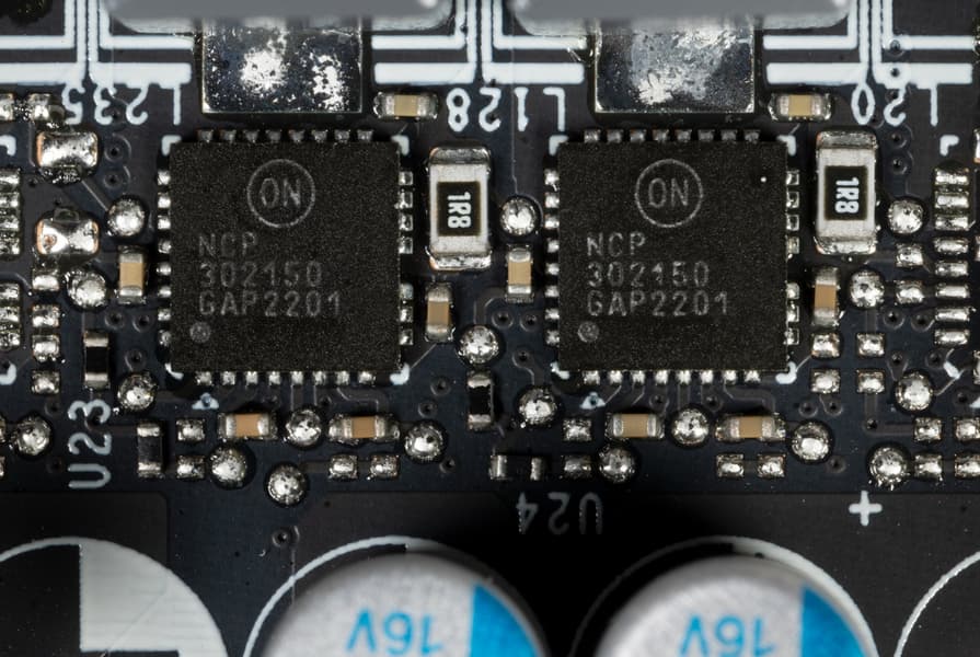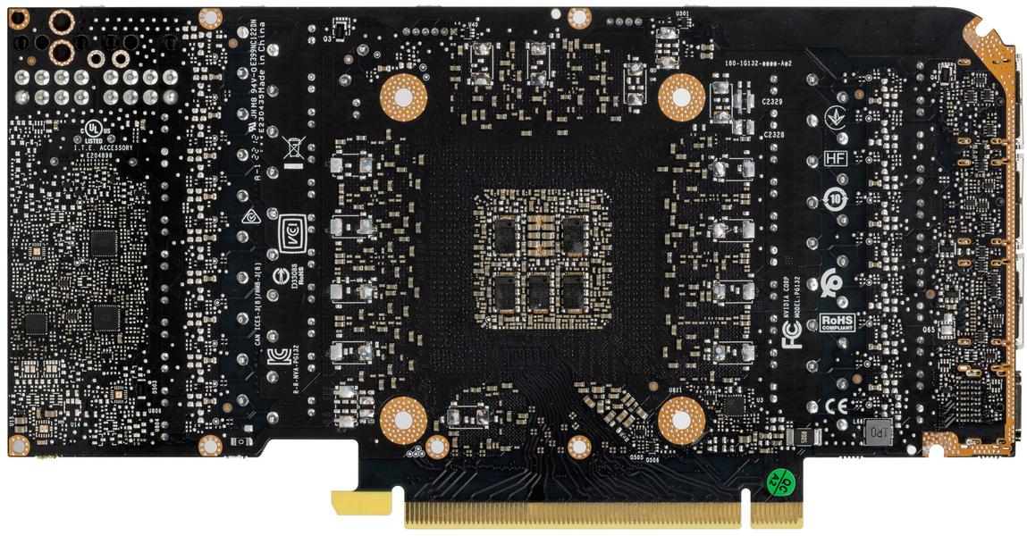 В преобразователе питания, традиционно для всех видеокарт Nvidia, используются транзисторные сборки DrMOS — в данном случае NCP302150 (On Semiconductor), каждая из которых рассчитана максимально на 50 А.
