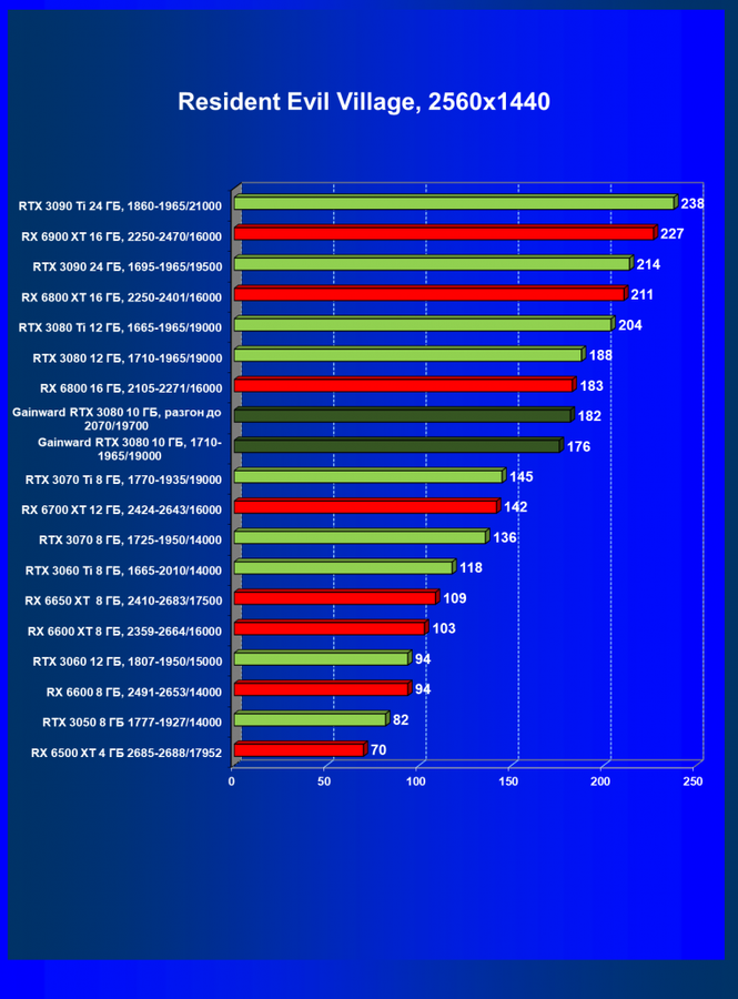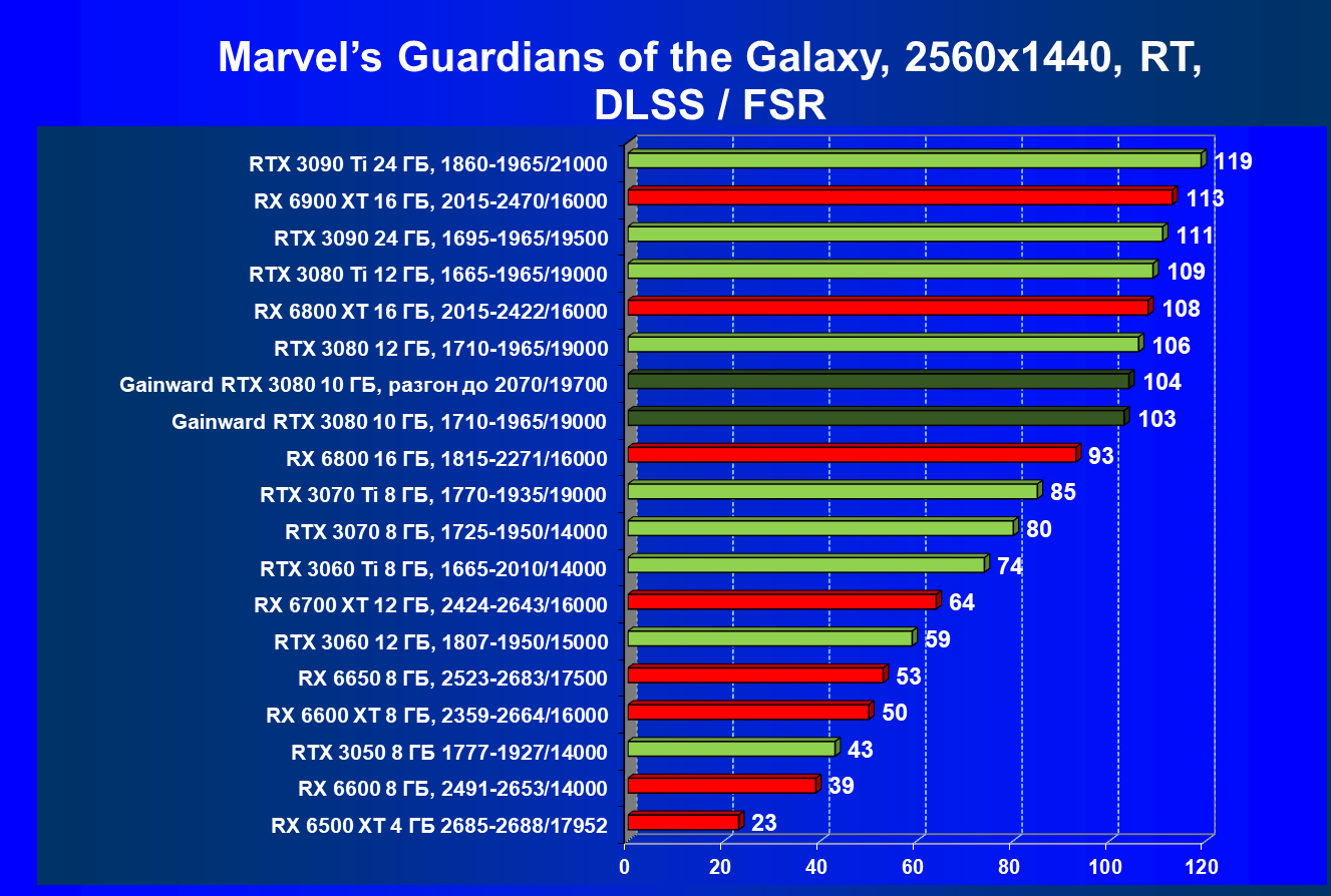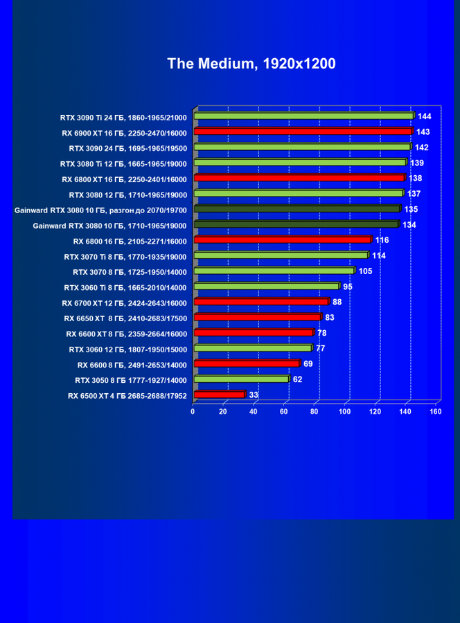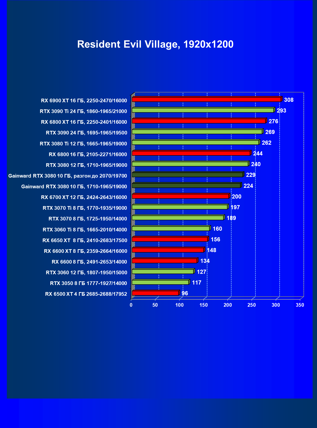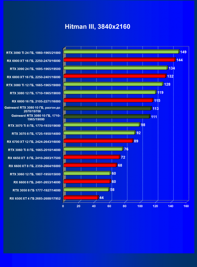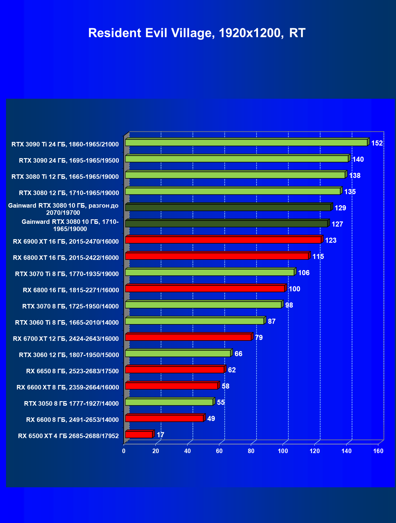 В целом соотношение сил уже давно известное: в классических играх Radeon RX 6800 XT чуть быстрее решения RTX 3080 c 10 ГБ памяти и на уровне RTX 3080 с 12 ГБ.