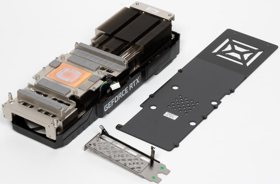 В целом концепция СО у этой карты соответствует той, что рекомендовала Nvidia при выпуске RTX 30: компактная PCB и система охлаждения, продувающая крайним вентилятором радиатор насквозь. Основой кулера является многосекционный пластинчатый никелированный радиатор с тепловыми трубками, распределяющими тепло по ребрам радиатора. Трубки припаяны к большой медной подошве, которая охлаждает ядро. По периметру этой подошвы закреплена фигурная рама, которая через термопрокладки охлаждает микросхемы памяти и силовые преобразователи VRM.