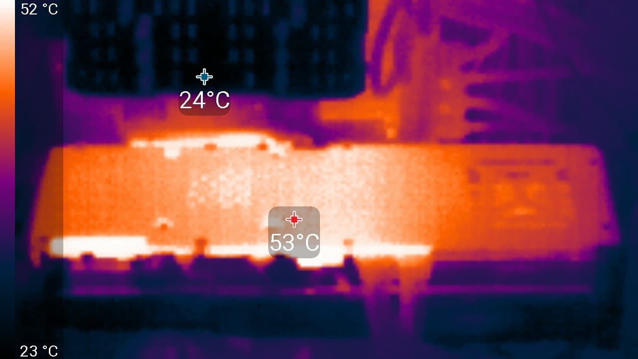 После 2-часового прогона под нагрузкой максимальная температура ядра не превысила 69 градусов, а температура микросхем памяти — 79 градусов, что является очень хорошим результатом для видеокарт такого уровня. Энергопотребление карты доходило до 327 Вт. Напомним, что безопасный предел нагрева памяти GDDR6X — 105 °C.