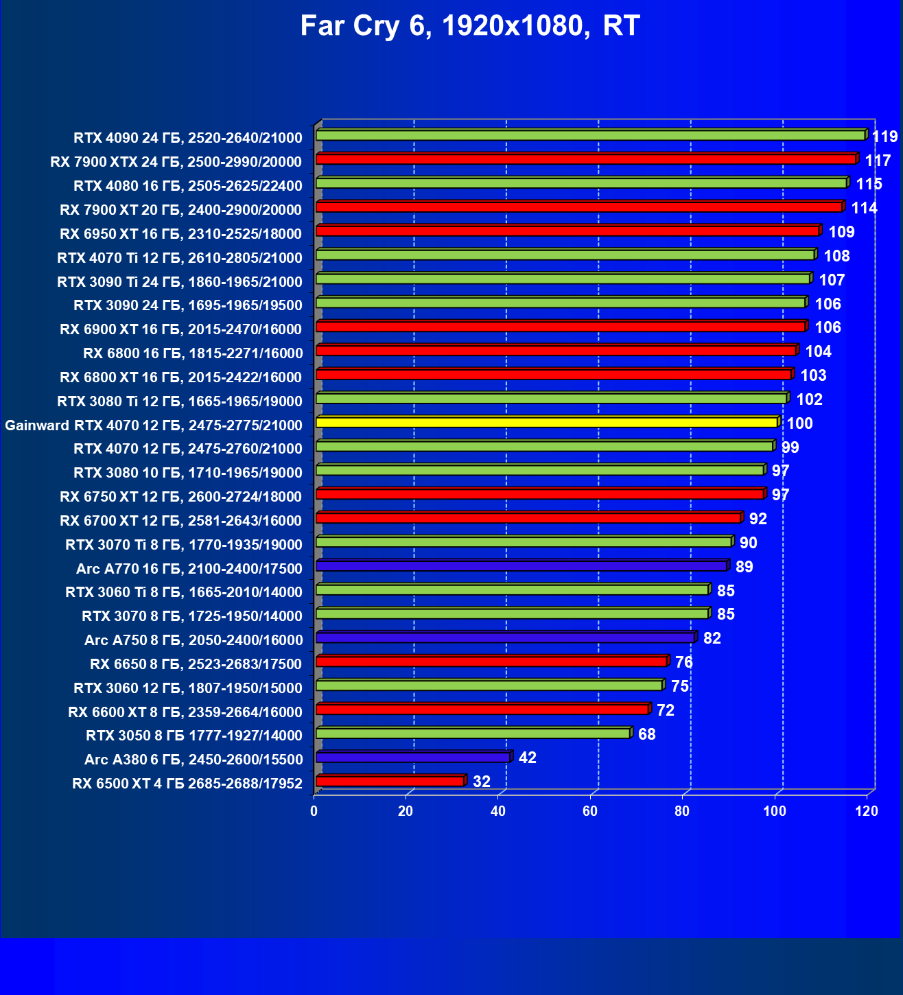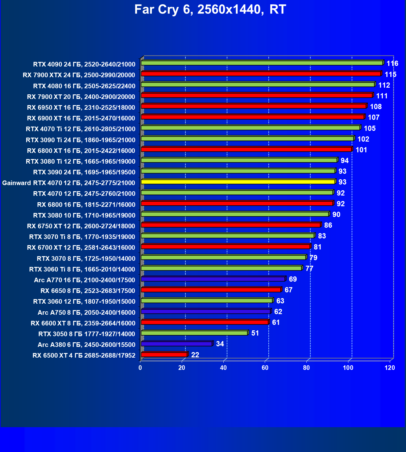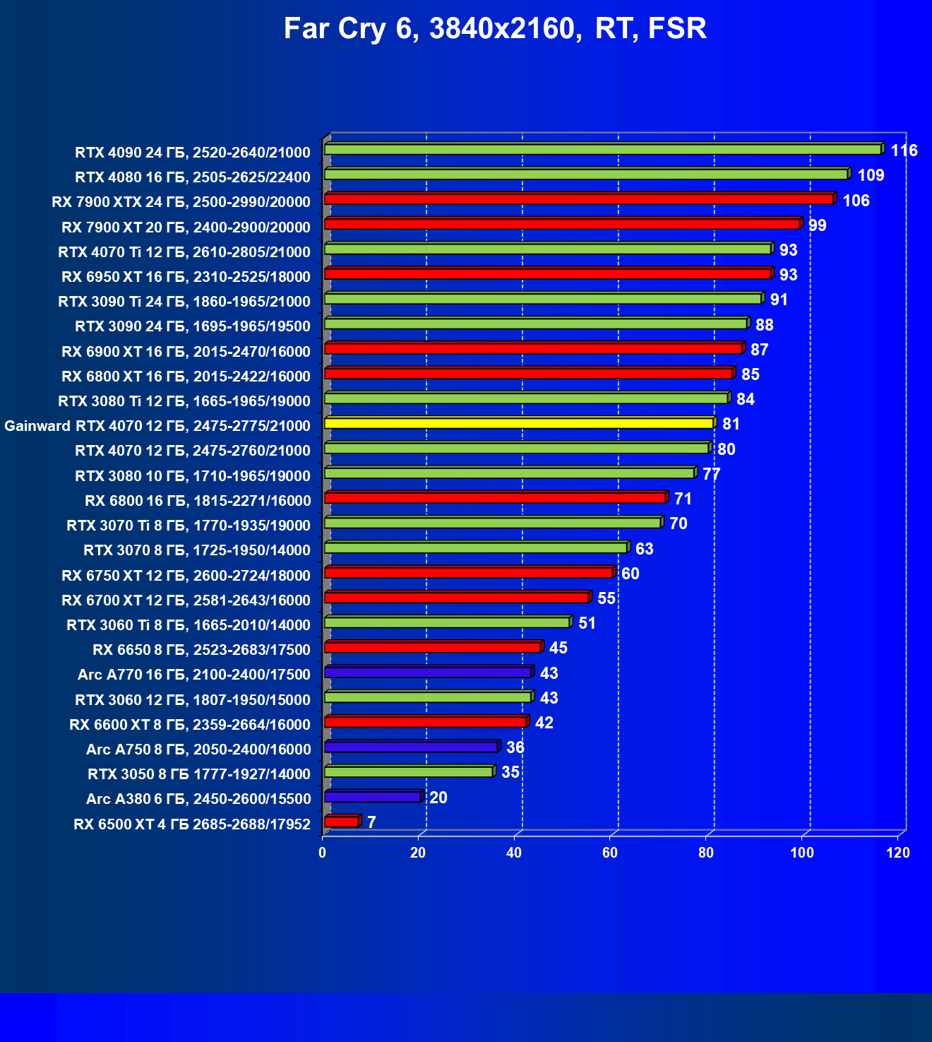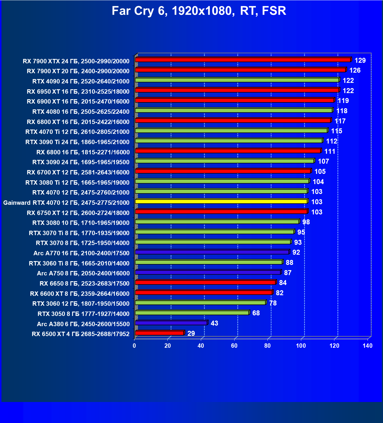 | 21 | RX 7900 XT 20 ГБ, 2400—2900/20000 | 92 | 792 | 86 000 |