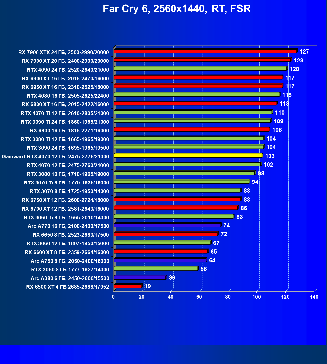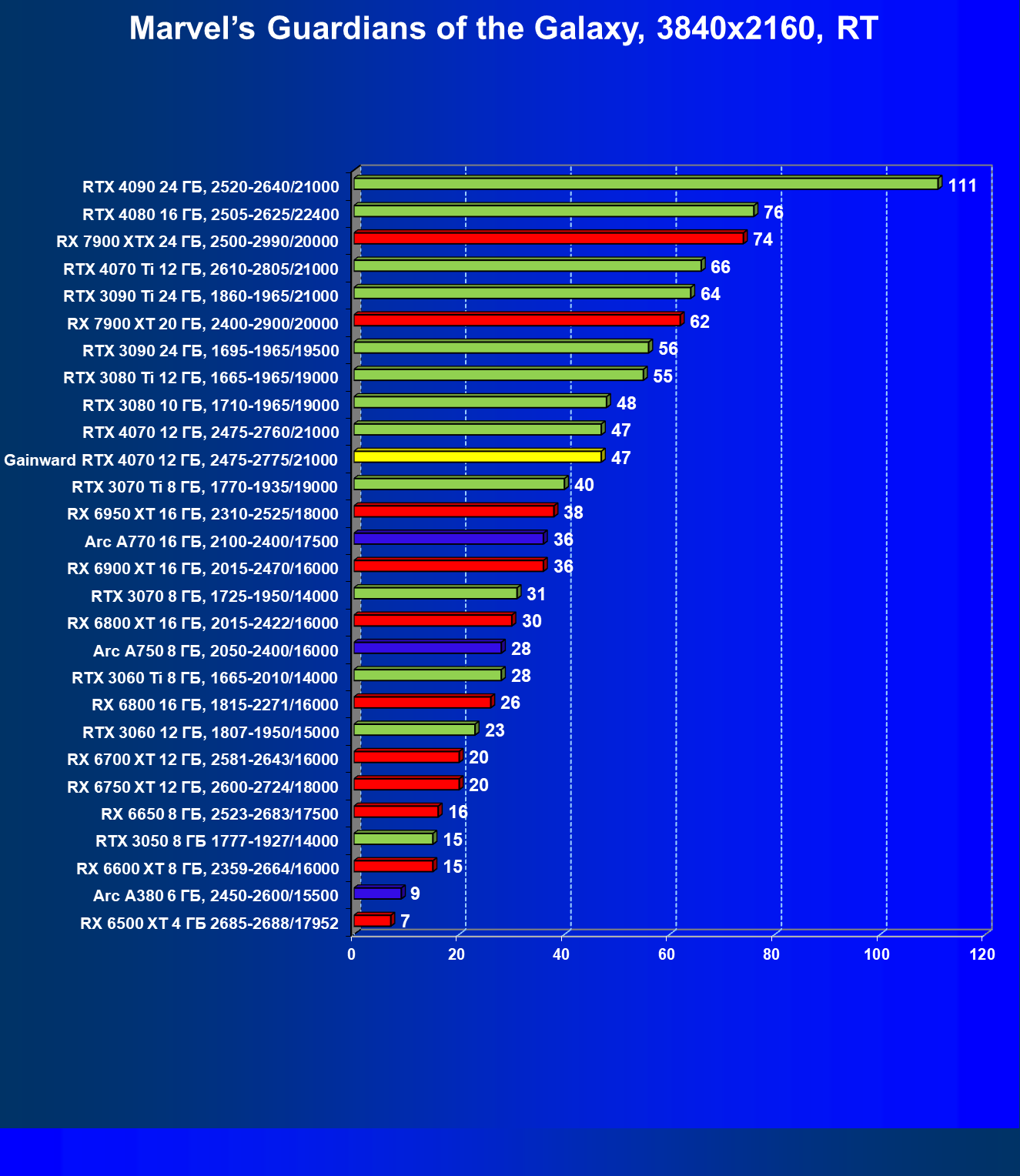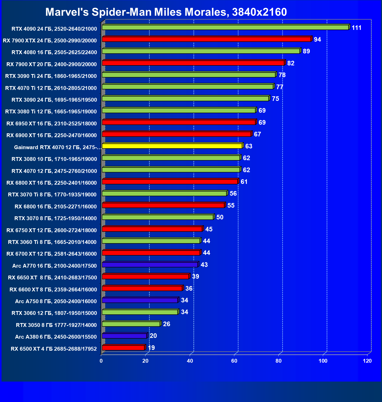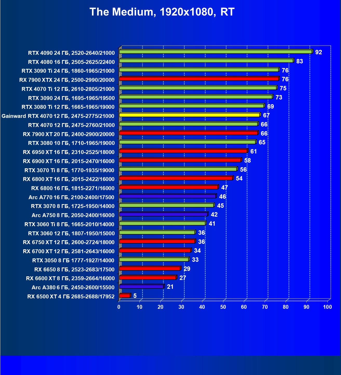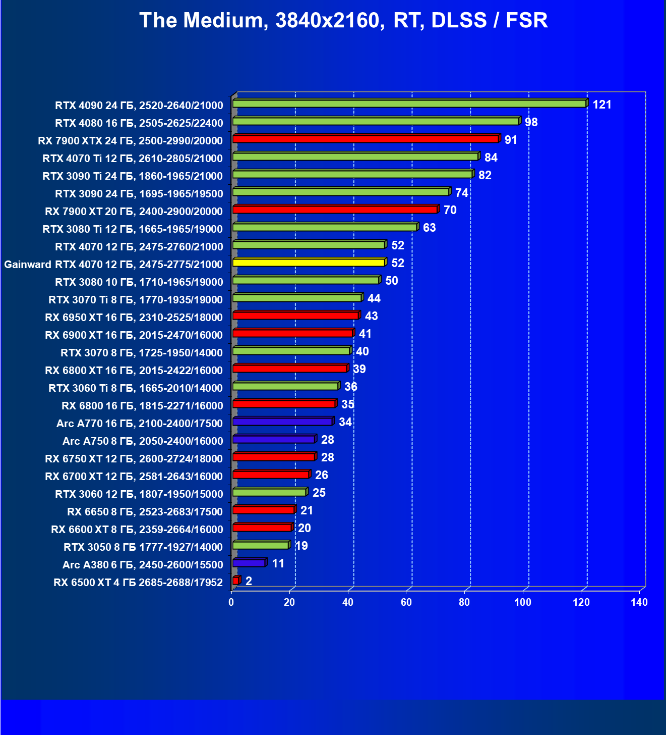 | 21 | RX 7900 XT 20 ГБ, 2400—2900/20000 | 92 | 792 | 86 000 |